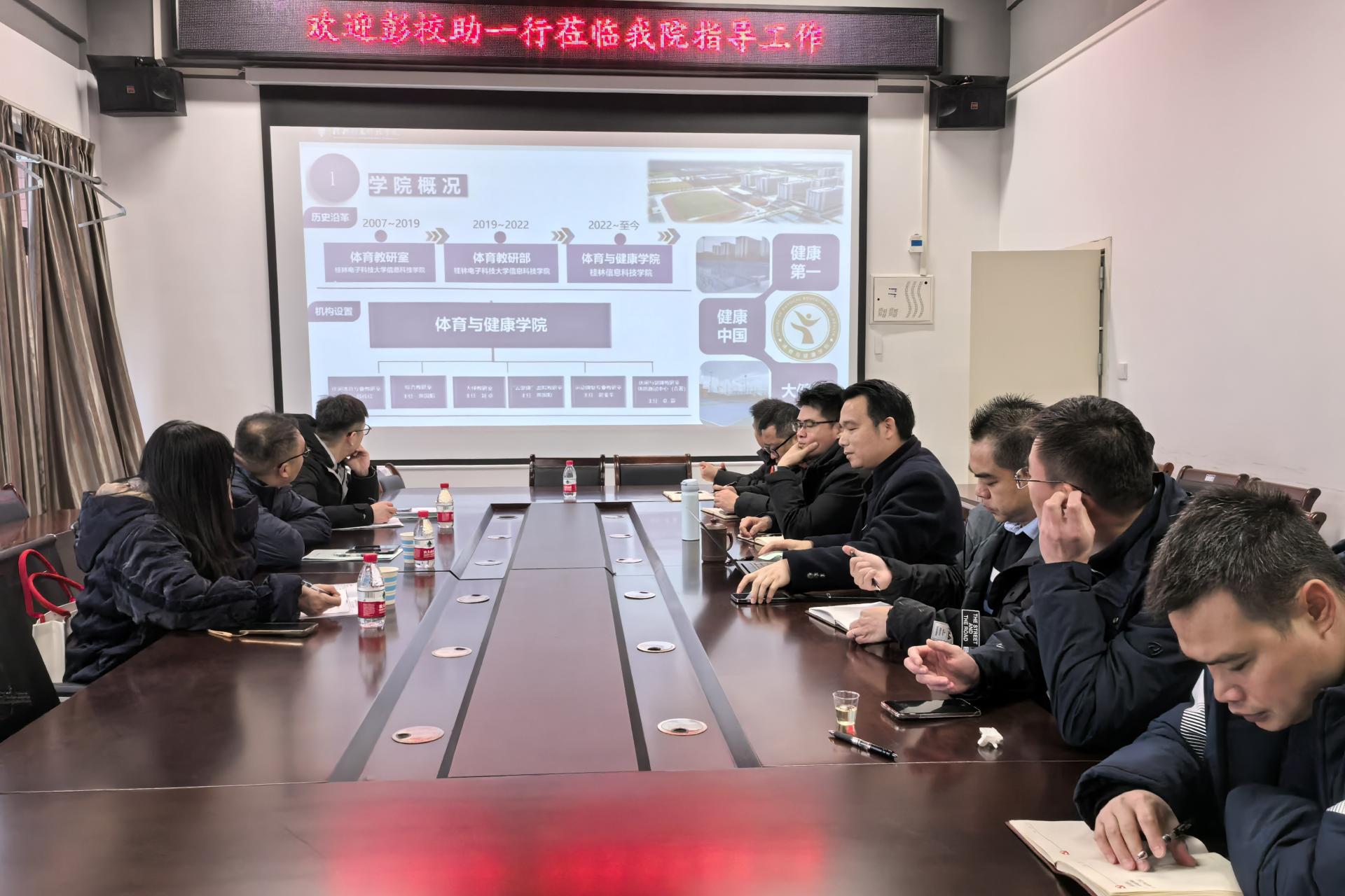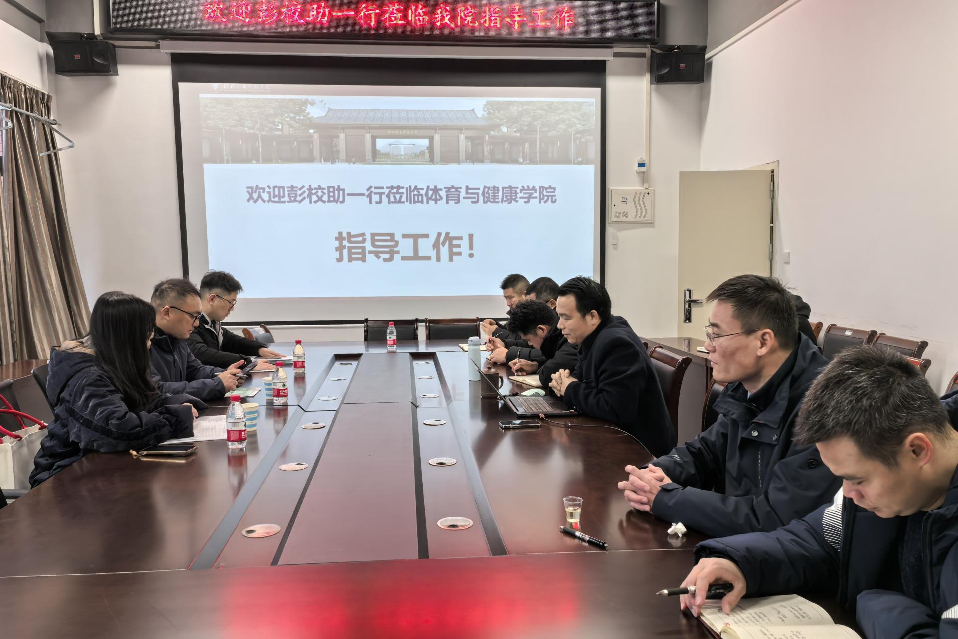 2月17日上午,校长助理彭鹏、基建与资产管理处处长龙艳萍、校实验中心副主任王涛一行来体育与健康学院督查期初体育教学工作。督查工作分两个阶段:第一阶段是现场听课查课,第二阶段是学院汇报期初教学准备工作和措施。汇报座谈会在体育馆205会议室举行,会议由体育与健康学院院长周勇主持,体育与健康学院党总支书记关永康、院长助理薛伟佳、院办主任、各教研室主任在行健楼会议室参加了此次会议。