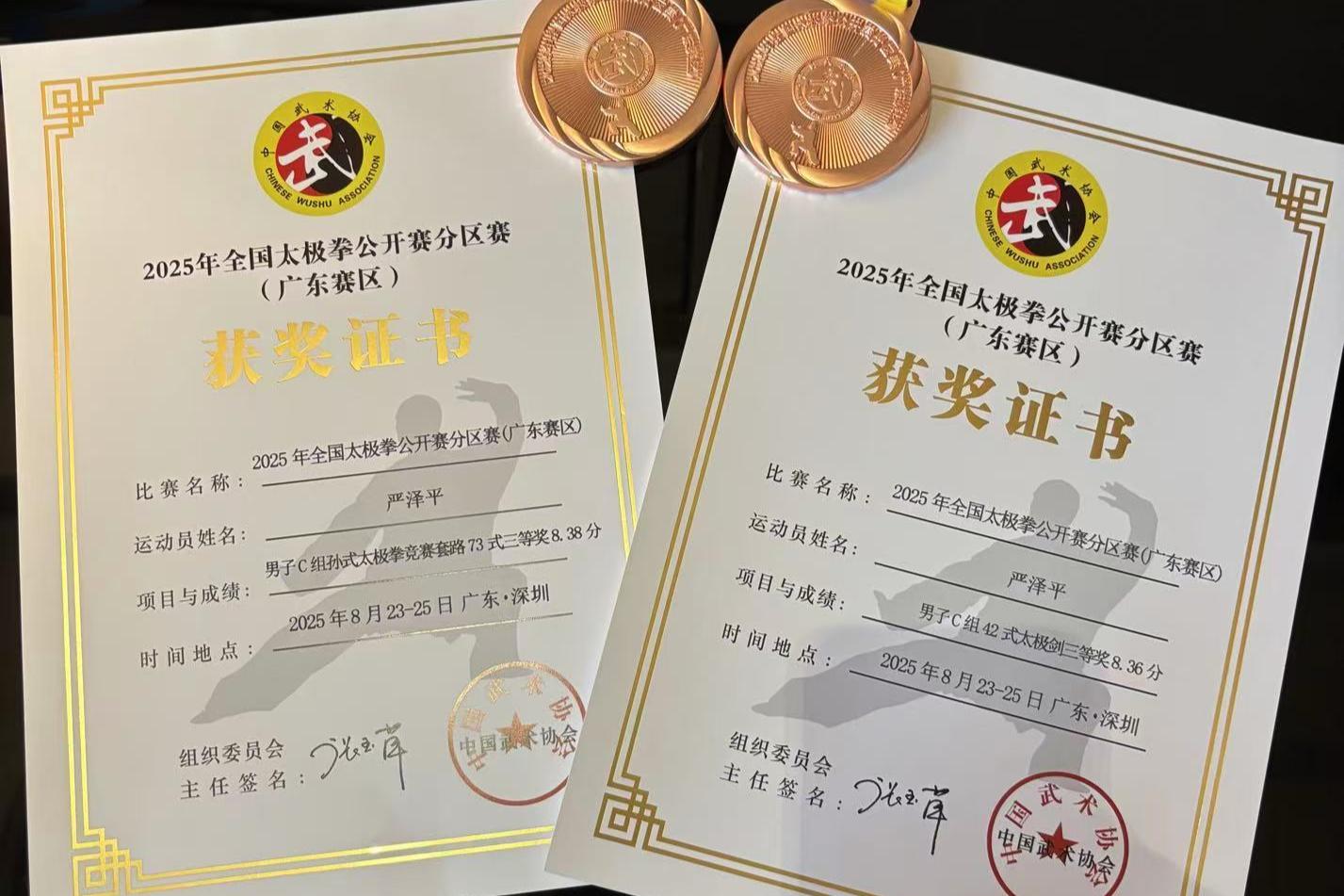 近日,2025年全国太极拳公开赛分区赛(广东赛区)暨广东省太极拳公开赛在深圳市光明区红花山体育中心成功举办。beat365官网体育与健康学院教师严泽平在比赛中表现优异,荣获孙式太极拳三等奖和42式太极剑三等奖,展现了beat365官网体育教师出色的专业素养与竞技水平。