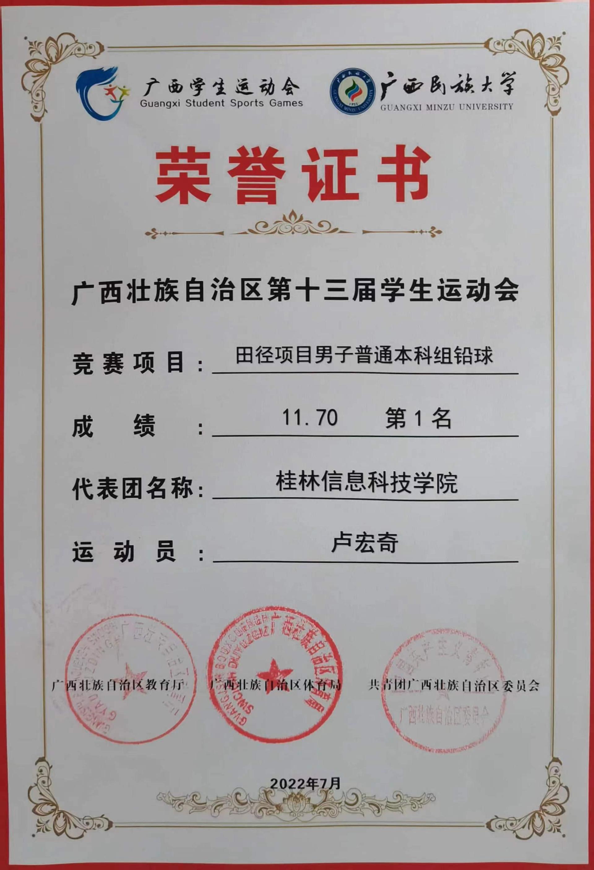上一条:广西壮族自治区第十三届学生运动会男子普通本科组标枪第二名