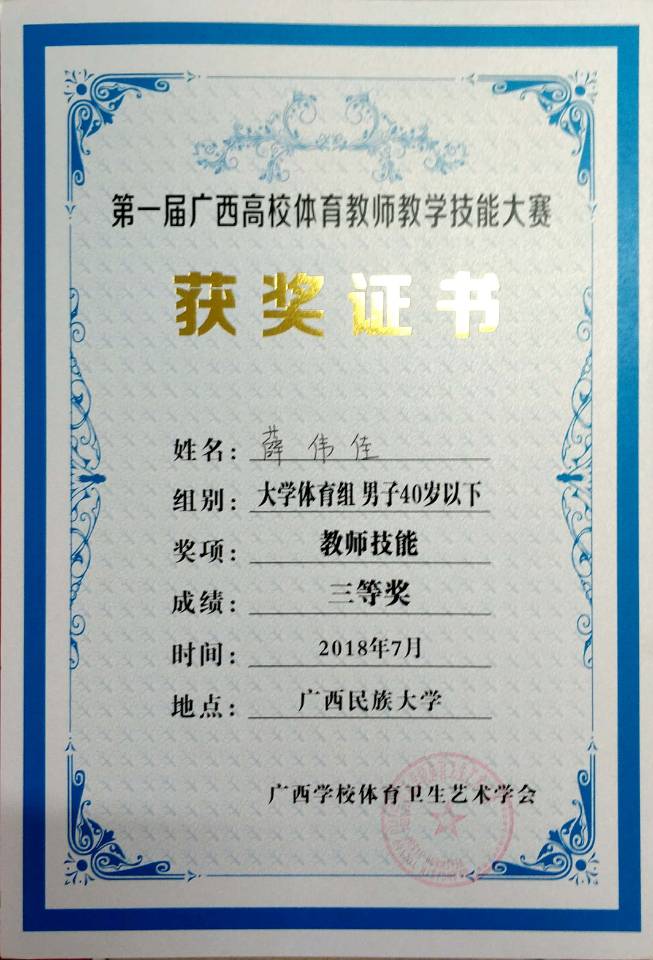广西壮族自治区大中专体育教师教学技能竞赛基本功二等奖