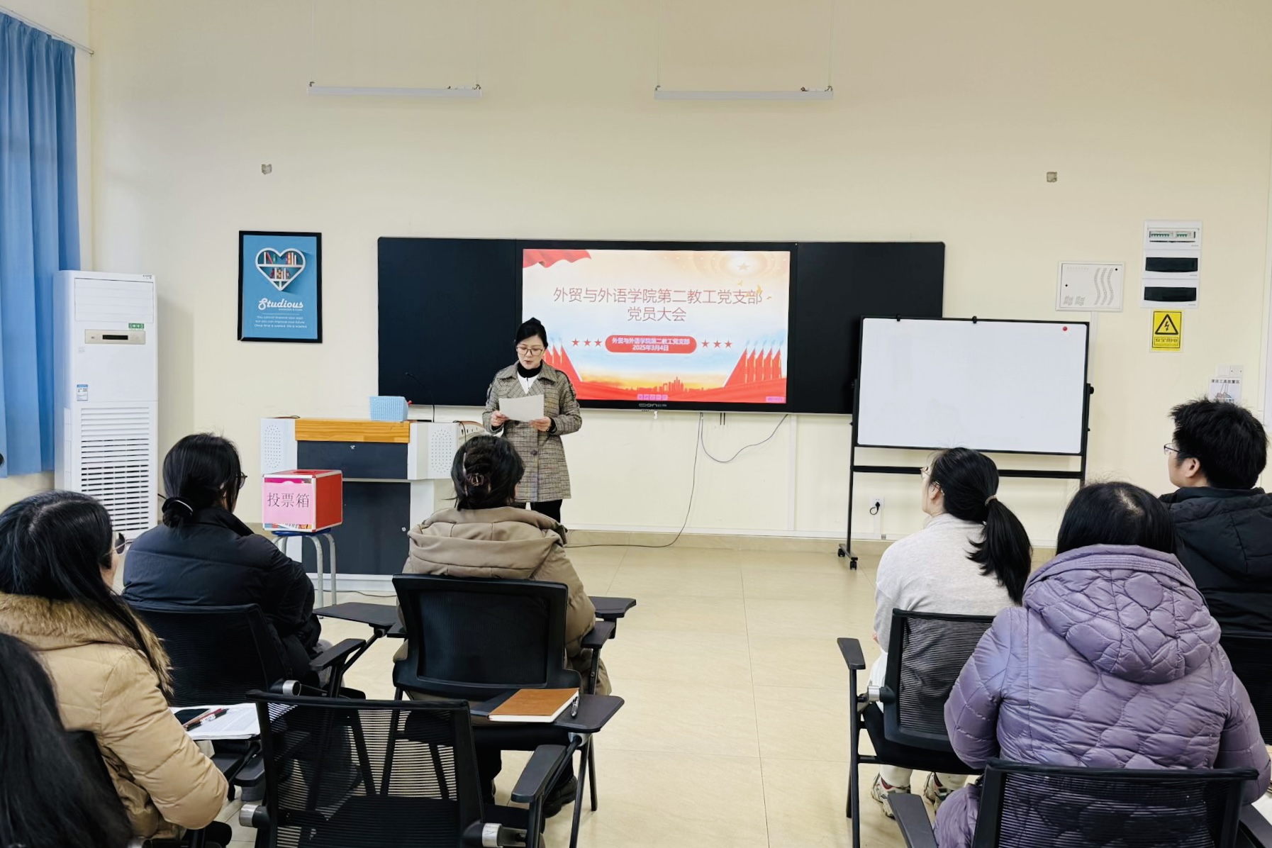 为贯彻落实新时代党的建设总要求,加强基层党组织建设,依据《中国共产党章程》《中国共产党基层组织选举工作条例》及相关规定,经党委批准,外贸与外语学院第二教工党支部于2025年3月4日在博文楼F213举行党支部委员会党员大会,对第一届支部委员会成员进行选举。会议由学院第二教工党支部书记黎秋艳老师主持,学院院长王家年、副院长赖安同志以党员身份参加。