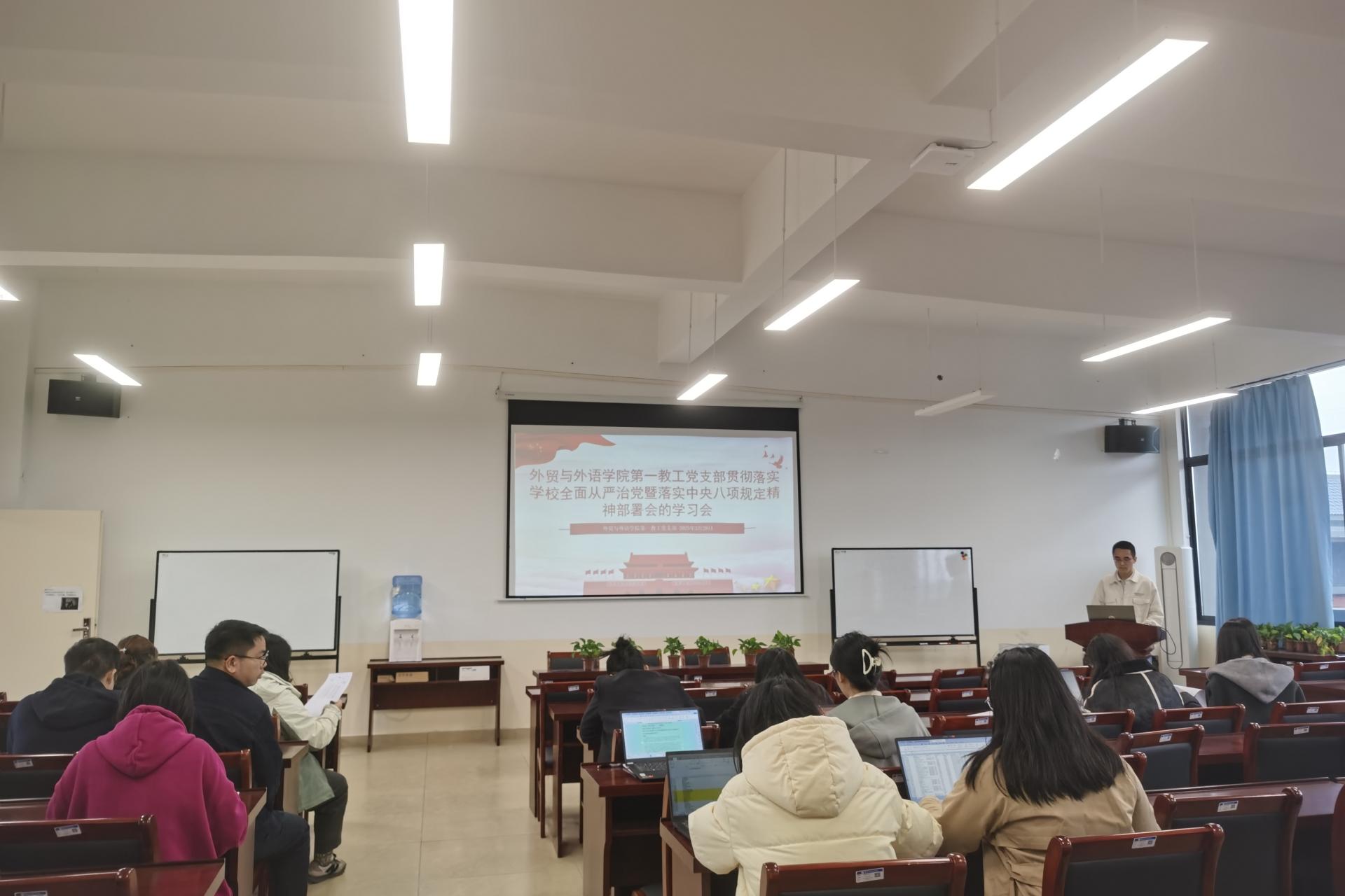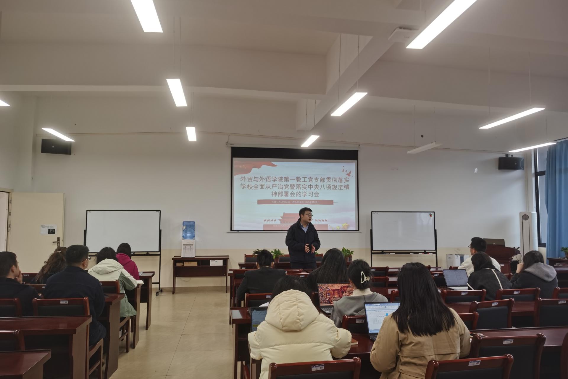 为贯彻习近平总书记关于深入贯彻中央八项规定精神学习教育的重要讲话和重要指示精神,2025年3月28日,外贸与外语学院第一教工党支部在博文楼F512召开学习会。会议由学院第一教工党支部副书记冯文雄老师主持和领学,支部全体党员参加了此次会议。