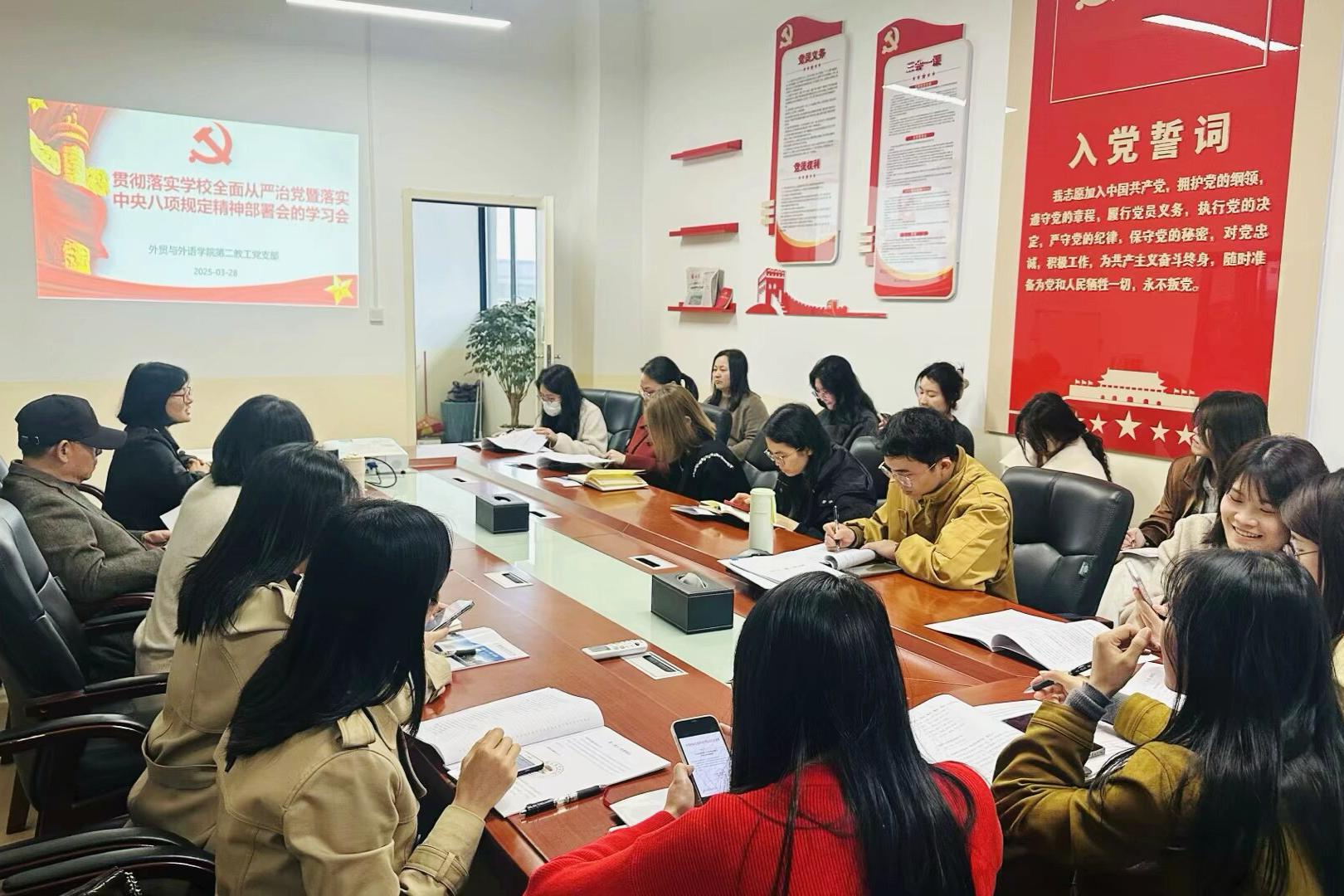 为深入贯彻落实党中央关于全面从严治党的决策部署,3月28日下午,外贸与外语学院第二教工党支部在博文楼F515开展学习会。会议由学院第二教工党支部书记黎秋艳老师主持,支部全体党员教师参会。
