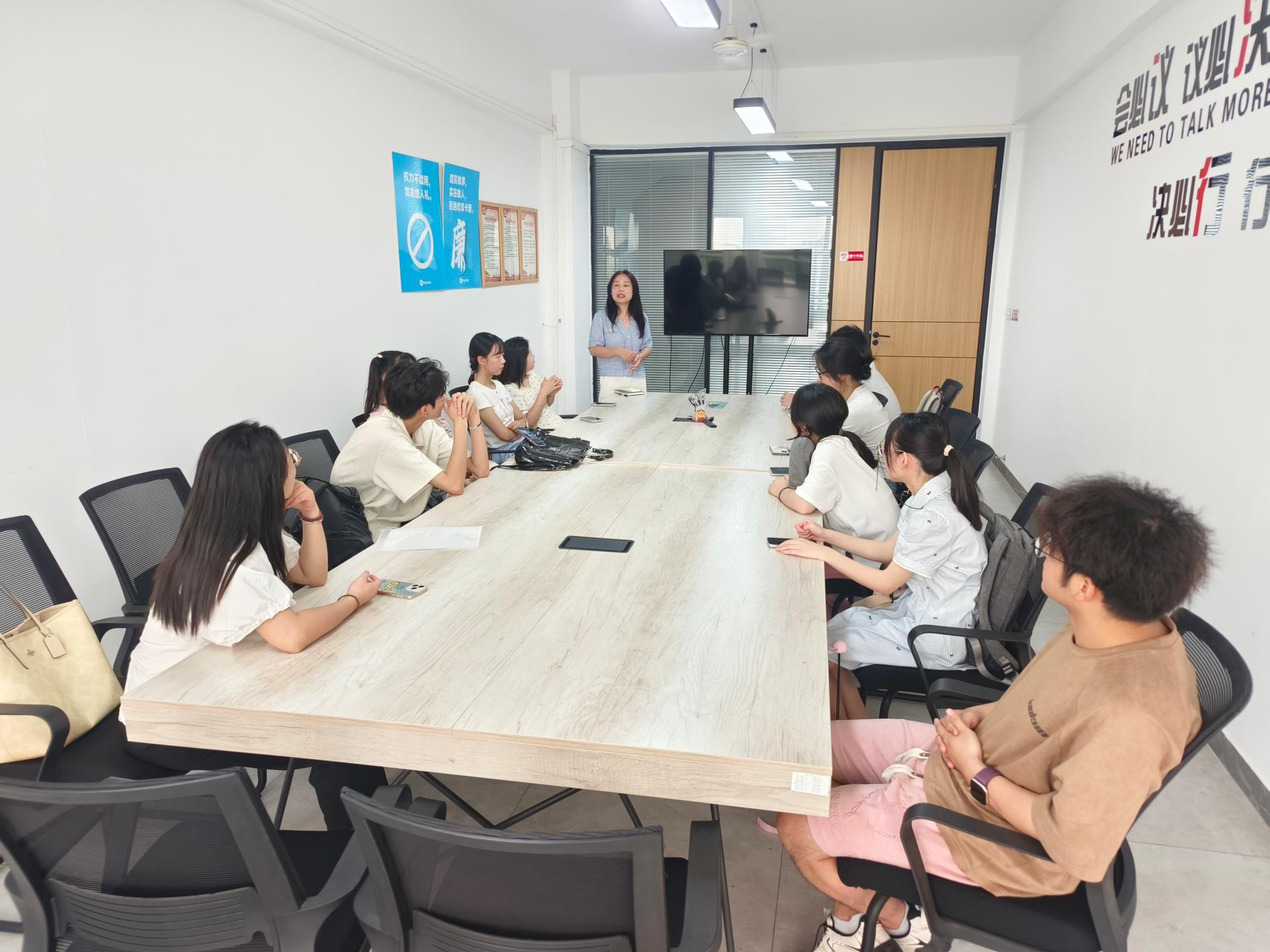 随后,师生与企业导师在办公大楼会议室展开深入交谈,围绕飞宇科技对商务英语人才的需求及商务英语专业课程设置合理性两大主题进行探讨。企业方详细介绍,当前公司在国际贸易往来、海外市场拓展中,对商务英语人才的需求呈现多元化特点:新媒体运营、国内外KOL开发与对接、直播运营、短视频内容策划等岗位需求量大。针对商务英语专业课程设置,企业导师建议强化新兴技术与商务应用的融合,如增设AI相关课程,帮助学生掌握多语种短视频脚本生成、营销文案创作、基础数据分析与可视化等技能,提升课程与行业需求的契合度。在接下来的实习中,学生们将深度参与企业外贸业务跟进、英文合同处理、海外客户沟通等实际工作,近距离学习商务运作流程和国际业务处理技巧,积累一线实践经验。