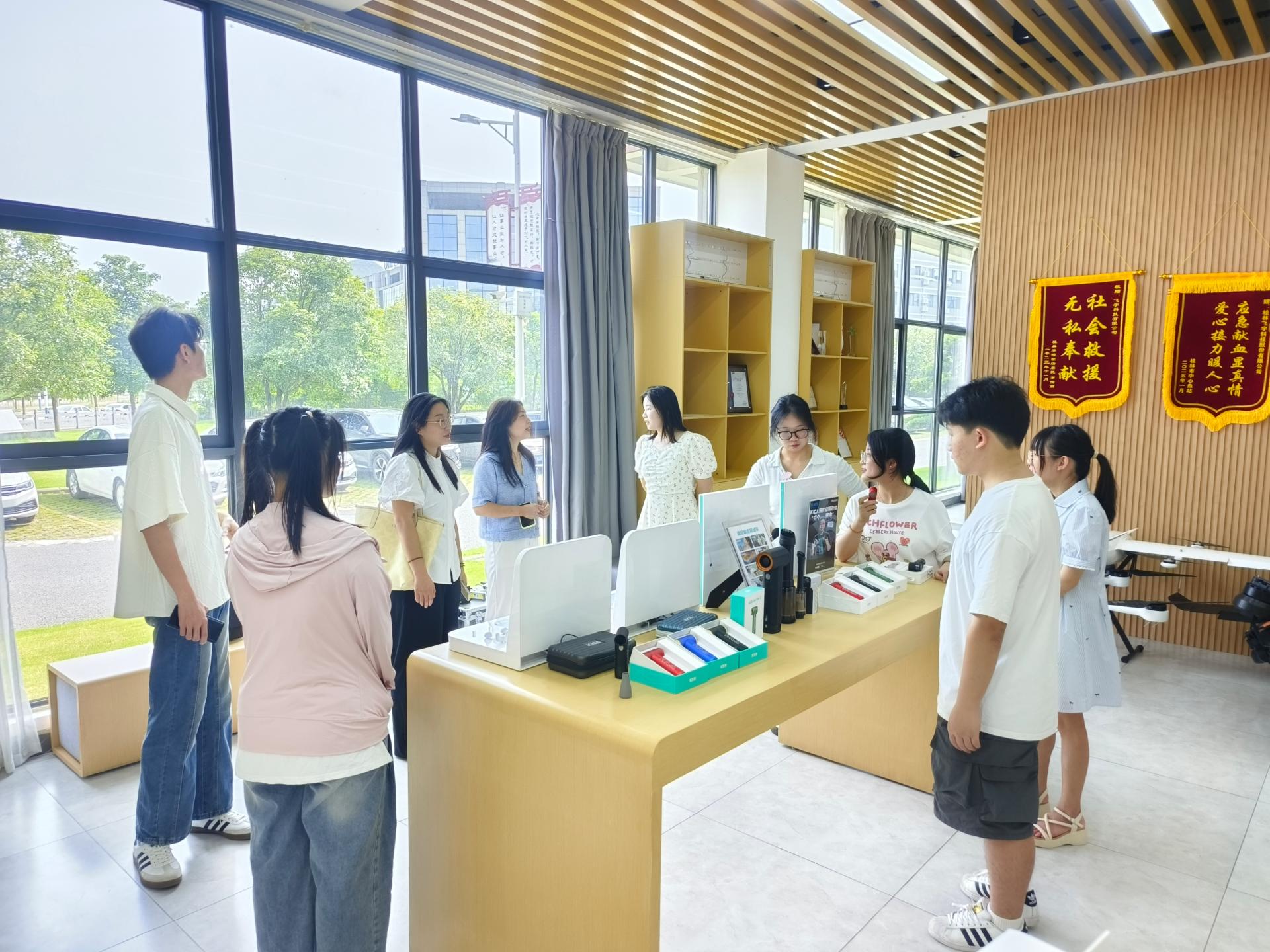 实习首日,在飞宇科技企业导师的带领下,师生一行参观了公司展厅。展厅内陈列的民用无人机、影像稳定器、筋膜枪等高科技产品及企业发展历程资料,让学生们直观了解了公司的主营业务、核心技术及市场布局,对企业的运营模式有了初步认识。