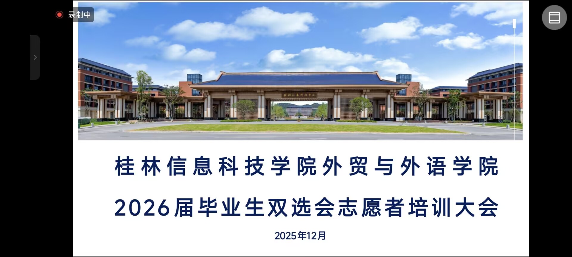 为保障2026届毕业生双选会顺利开展,提升志愿者服务质量,12月14日,外贸与外语学院在线上召开双选会志愿者培训大会。学院党委副书记杨锦超主持会议,54 名志愿者参会,系统学习服务规范与工作要求,为双选会顺利开展筑牢服务保障。