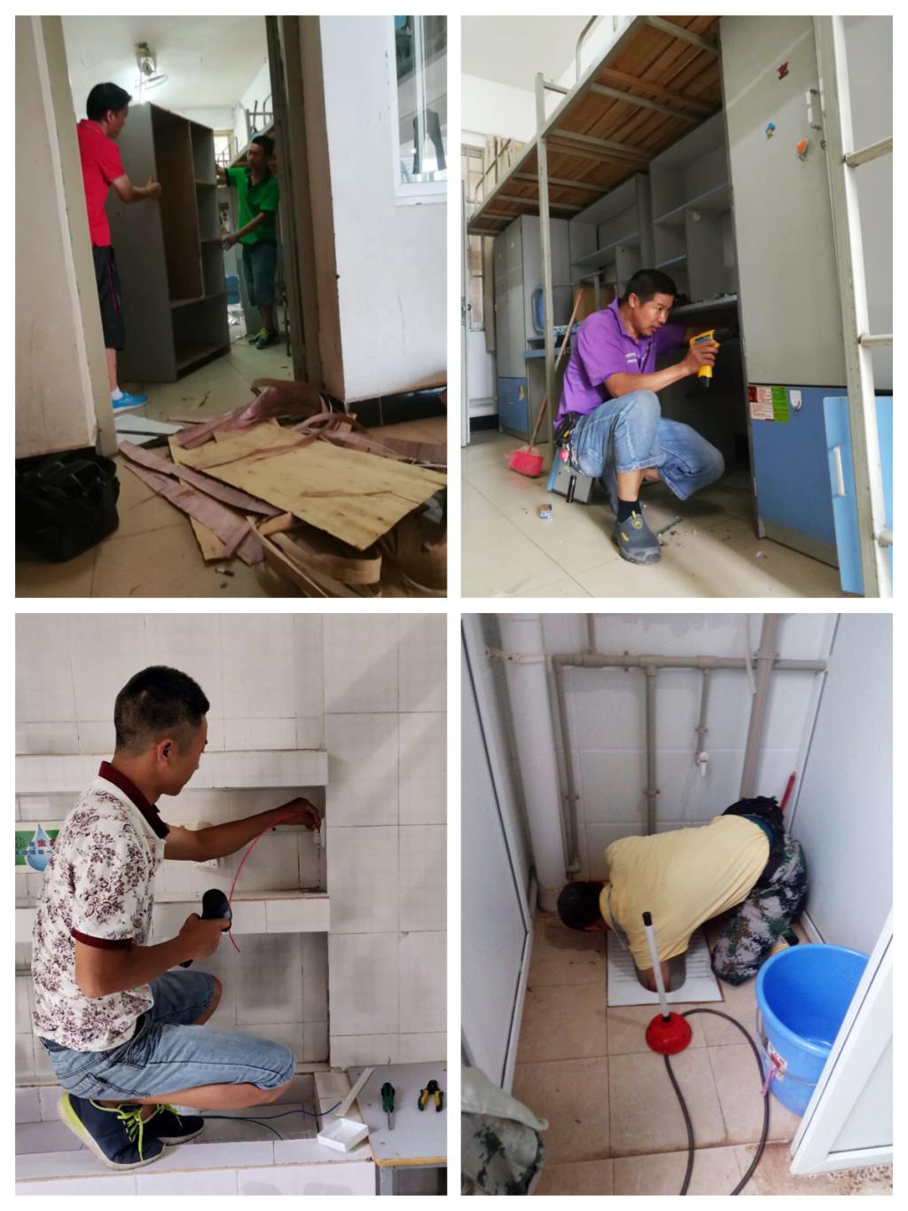 三、聚焦细节,维保检修面面俱到。暑期维修工作的重点是配合公寓中心完成毕业生宿舍检修及新生宿舍的改造,因工期紧,任务重,为了确保新生的顺利入住,维修中心对搬迁的270间毕业生宿舍开展了地毯式检查,小到一块衣柜锁的扣皮,大到门锁、热水,都认真仔细确保完好无损;对145间新生宿舍进行了饮水机线路改造、热水管道改造,对所有改造间进行布线。