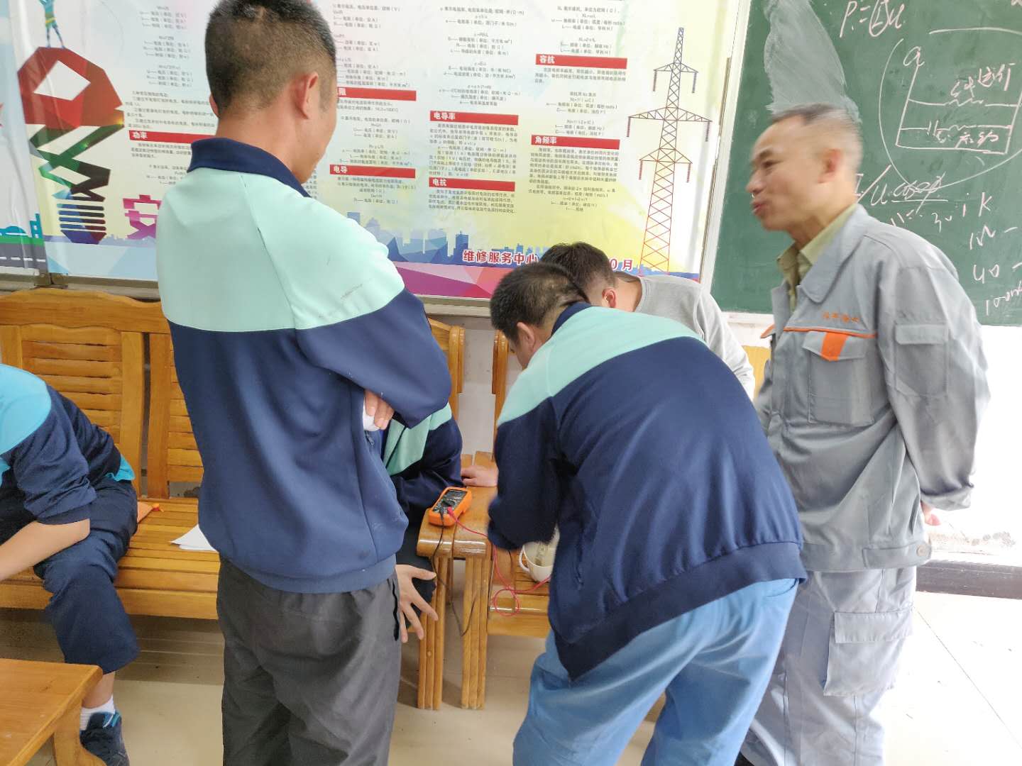 培训通过理论联系实际,先从理论着手,通过讲解风扇电路图的形式,让受训人员了解到风扇运行的原理。随后示范如何用万用表测量风扇电容的接入点,以及造成风扇反转的电路接法。讲解结束后,员工们围坐一团,亲自动手操作,将学习到的知识现场进行实践,并相互讨论,做到真正理解和熟练掌握所学的知识。