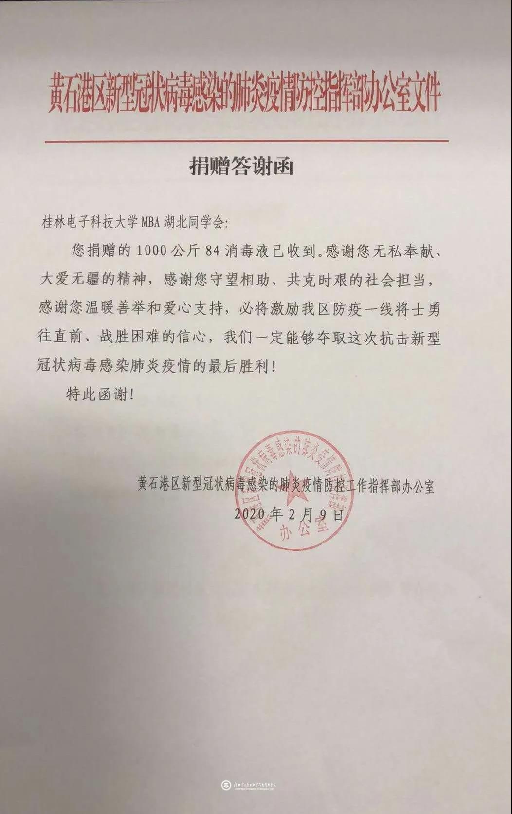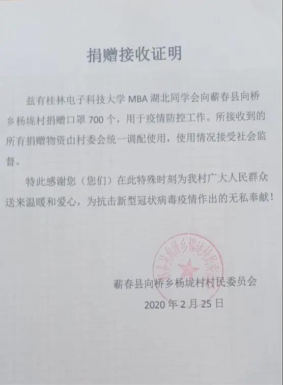 在知晓黄冈黄石两地基层医院和社区抗疫一线医疗防护用品紧缺时,他看在眼里,急在心里,便四下打电话,寻求支援,通过桂电MBA湖北同学会理事平台,他参与发起了抗击新型肺炎募捐行动,向广大MBA校友发出倡议,共募捐善款近11万元口罩700只,他个人也捐款3000元,并以最快的速度寄回村里,解决了燃眉之急。