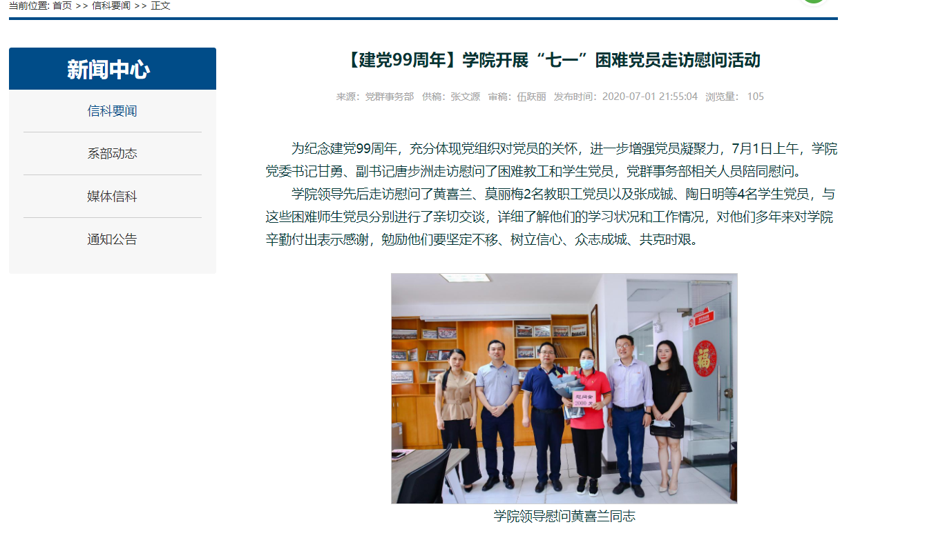 为庆祝建党99周年,充分体现党组织对党员的关怀,进一步增强党员凝聚力,7月1日上午,学院党委书记甘勇、副书记唐步洲走访慰问了黄喜兰同志,院长助理、支部书记宋海军、党群事务部相关人员陪同慰问。