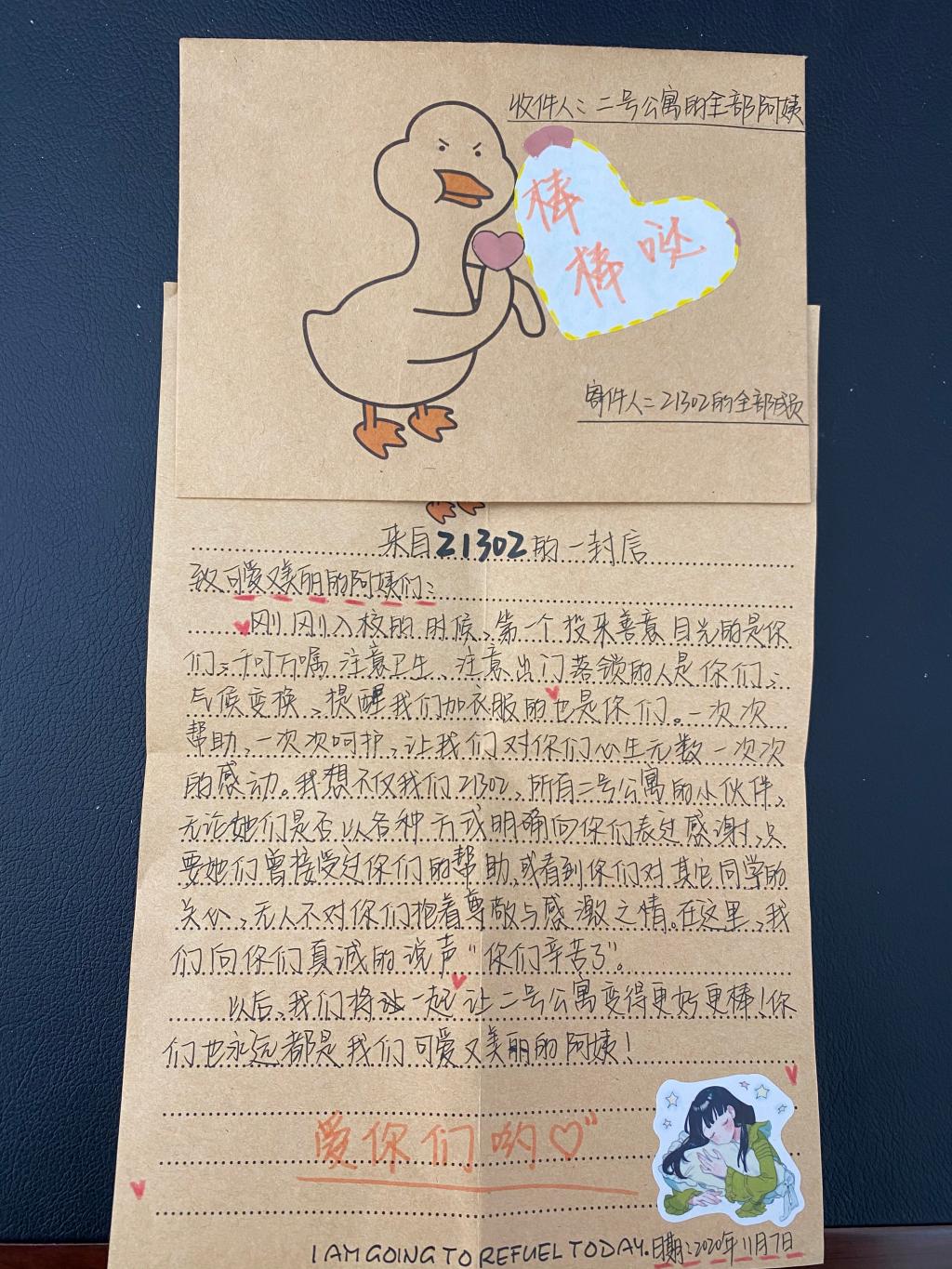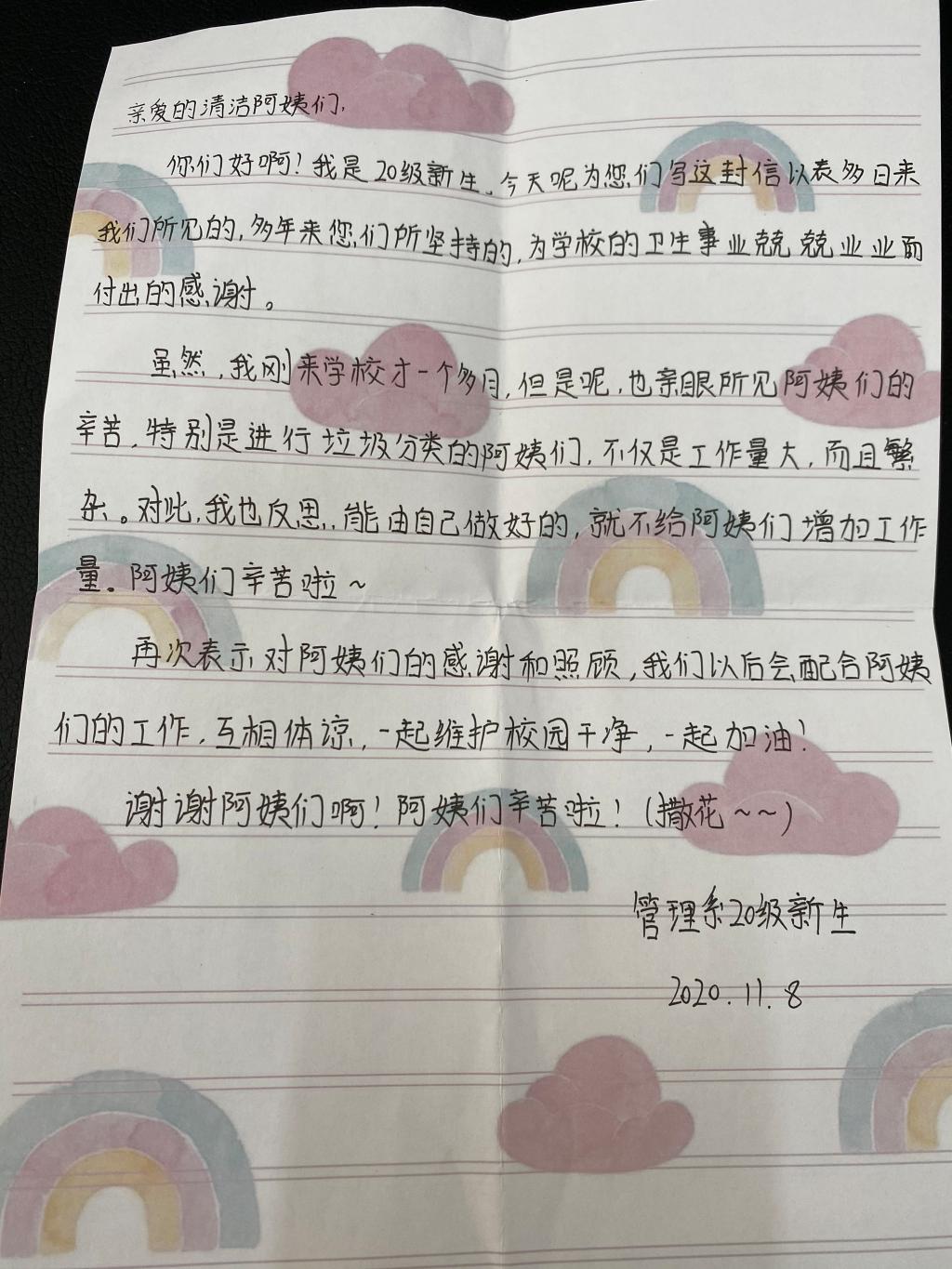 11月9日,公寓服务中心阿姨们收到多封来自2020级新生们的感谢信。
