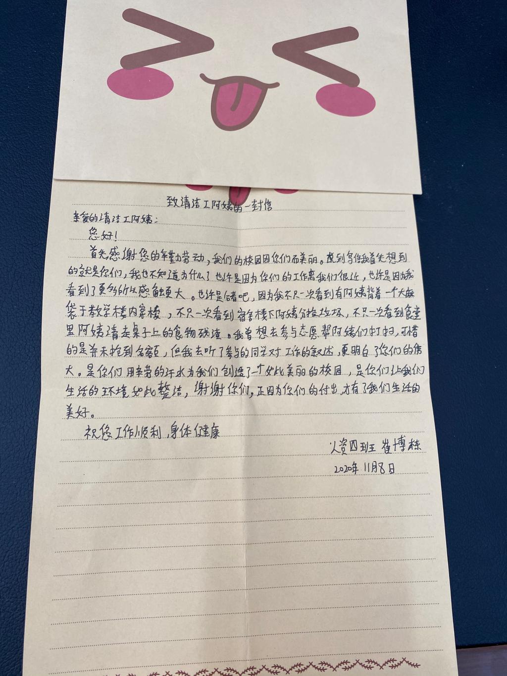 她们在信中表示,自进入到信科公寓这个大家庭以来,虽然只有短短两个月,她们却见证了什么是责任、大爱、和谐、勤劳、体贴。公寓阿姨把宿舍当作家一样维护,把学生当作孩子一样呵护,为她们的爱心和行为而感动。同学们对和蔼可亲的阿姨表示深深的谢意,感谢她们每天就像是送孩子上学的妈妈,万千叮嘱,满眼都是关怀——“要保持宿舍卫生”、“注意关水断电”、“离开宿舍要关门关窗”、“天气转冷要注意保暖”、“肚子疼了阿姨为我熬红糖姜水”、“保洁阿姨小小的身躯承载的是干净舒适的生活环境”、“衣服破了阿姨给帮忙缝补”……一封封信笺,一句句感动的话语,寄托了同学们满满的感谢与信任。