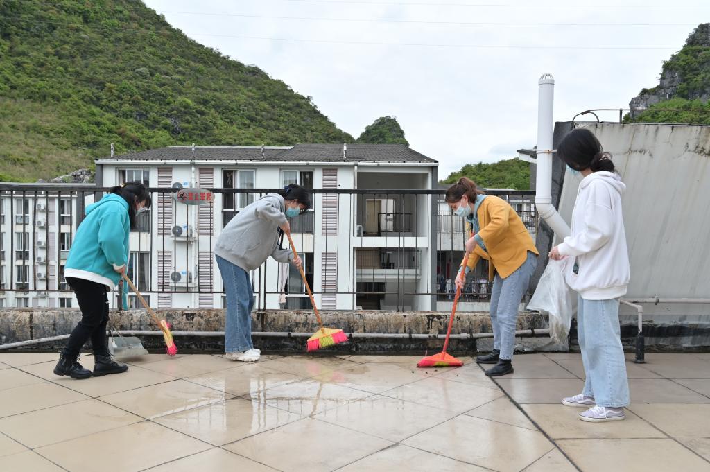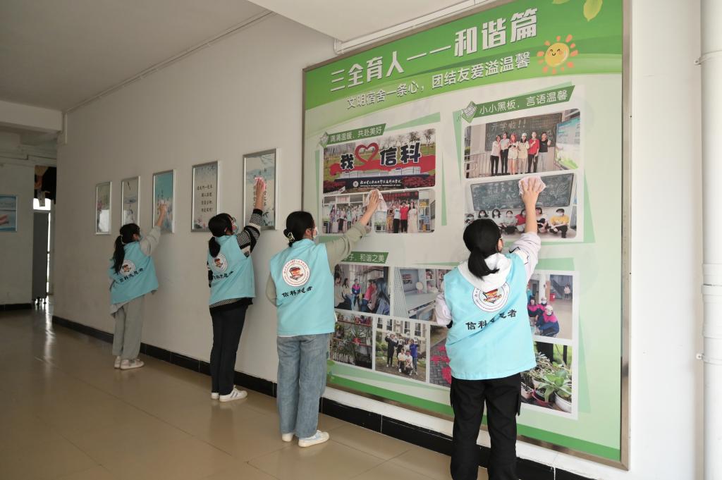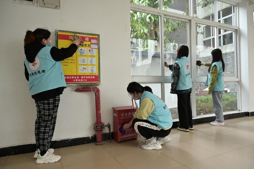 在公寓生活老师的安排下,志愿者们迅速进行分工,有的负责对公寓内绿化带和草丛的杂草、落叶或杂物进行集中清理,有的认真擦拭公共楼道的消防设备、宣传画框、楼梯扶手等。经过一个多小时的辛勤劳动,学生公寓容貌焕然一新,环境得到进一步美化,看着自己的劳动成果,志愿者们露出了会心的微笑。