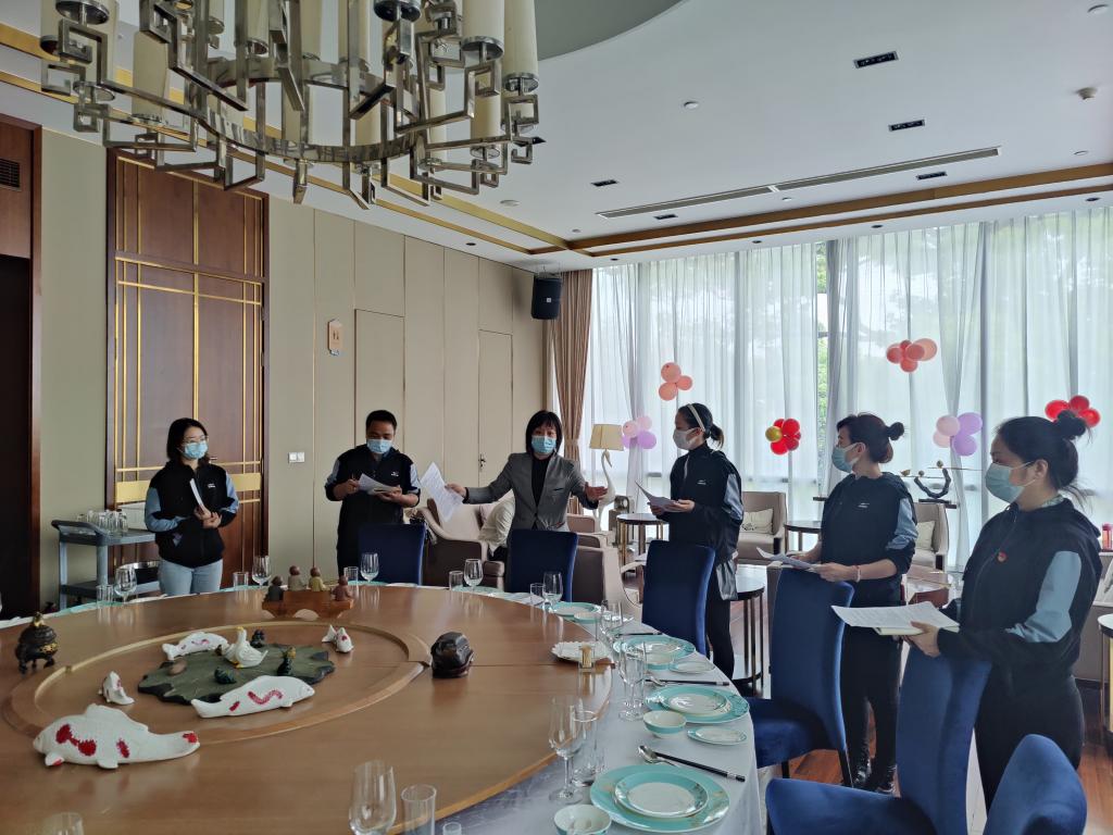 为提升后勤员工在包厢接待工作中的服务质量,4月21日下午,总经办经理奉燕带领公司管理人员6人,到漓江勝宴餐厅参加接待礼仪培训学习。