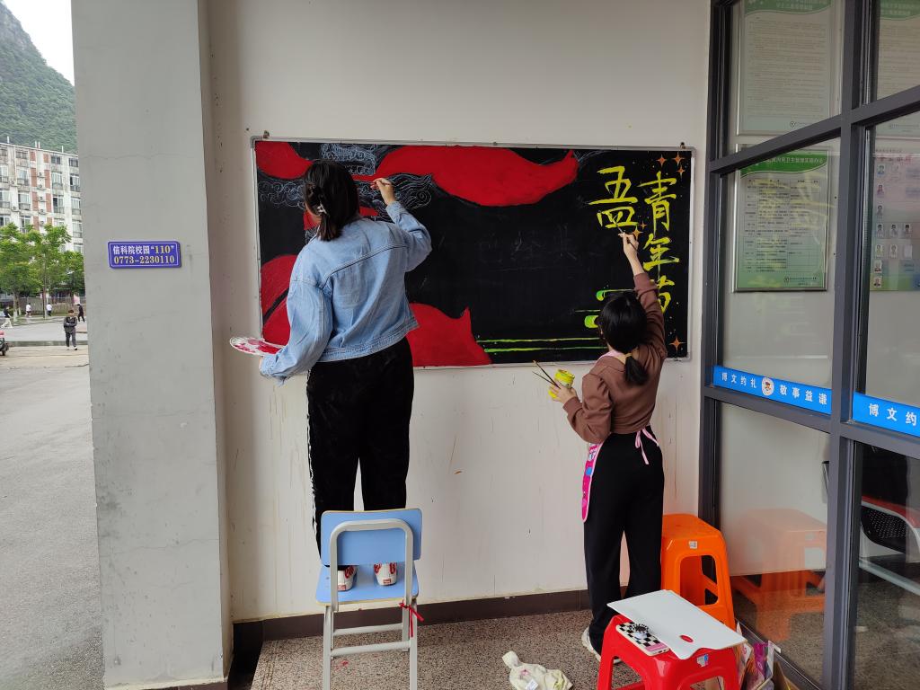 除此之外,创意设计学院的同学们手执画笔绘风采,以五四青年节为主题绘制黑板报,向全校学生展示共青团的青春活力及“永远跟党走”的坚定信念。