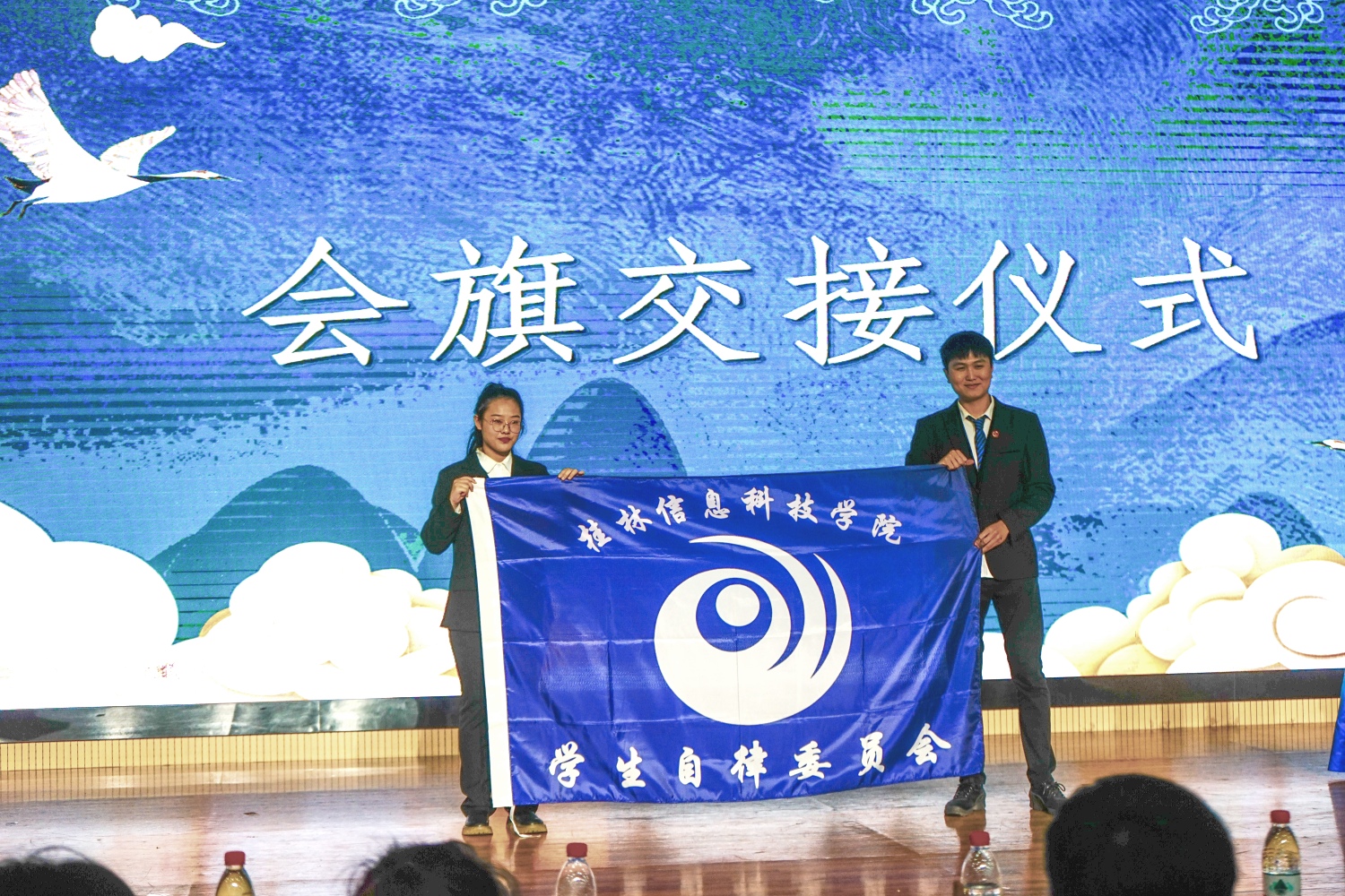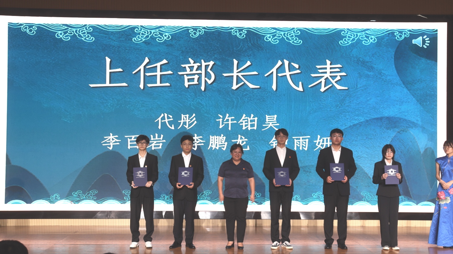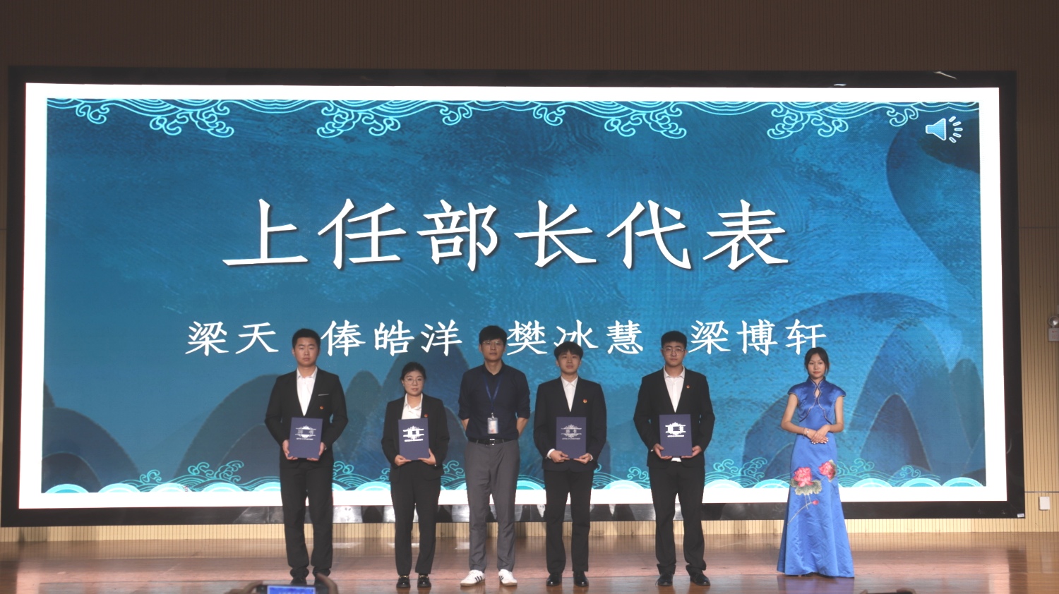 大会公布了第一届优秀干部、优秀助理、第二届自律委员会委员名单,周璇老师、莫丽媛老师和周阳霖老师、王全萍老师分别为第一届校学生自律委员会主席团成员、各部门部长颁发聘书、纪念册、奖状。随后,新老会长交接会旗,并用各部门的精彩视频,讲述了各部门的成长及未来的展望,在欢乐的气氛中,委员会成员们将活动蛋糕推到了台上,伴随着生日歌,将现场氛围推至高潮。