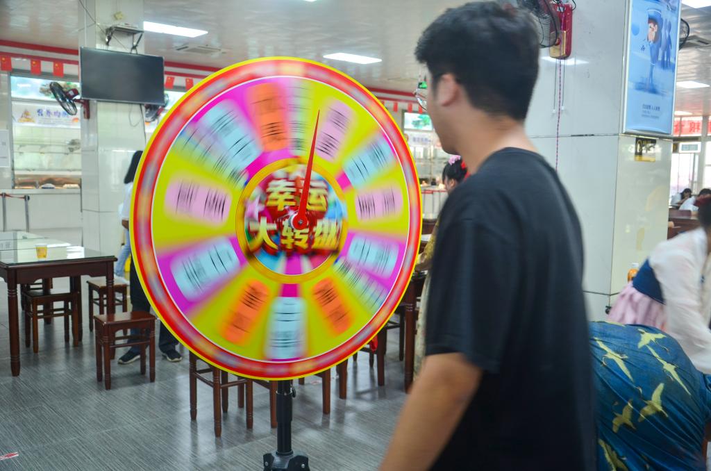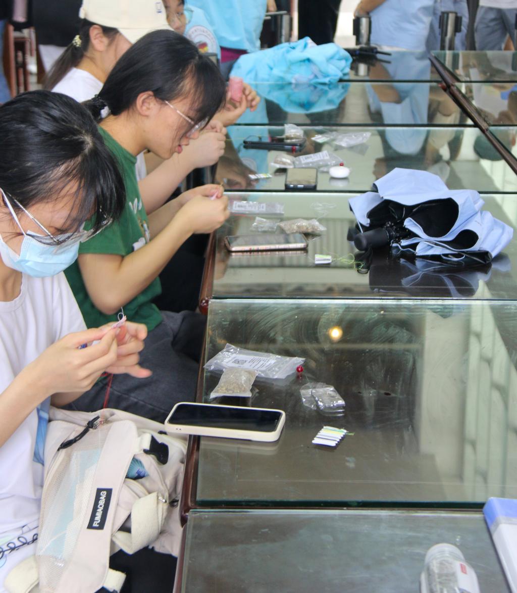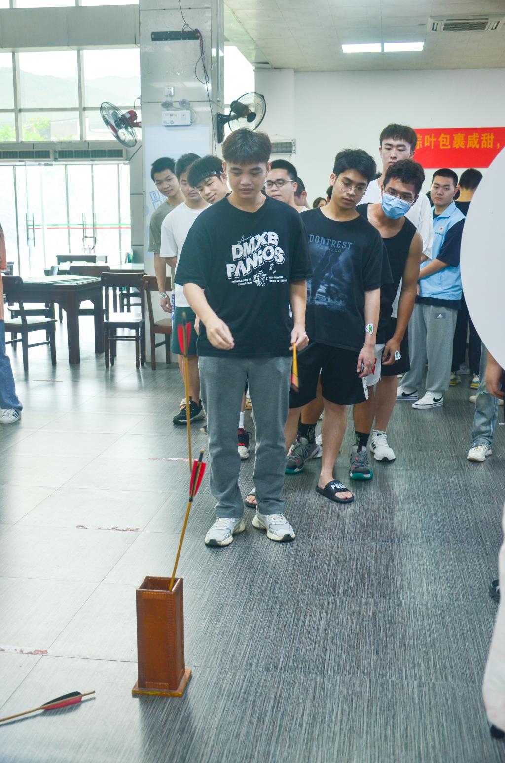 活动现场设有端午节传统游戏“投壶”,只要投壶进者即可参与转盘活动,并且获得相应礼品,现场的长桌上摆满了各式各样的礼品,有粽子,鸡蛋,以及各式各样的香囊。现场还设有包粽子体验区和艾叶香囊制作区,由食堂阿姨现场教学如何包粽子以及学生自己亲手缝制香囊。