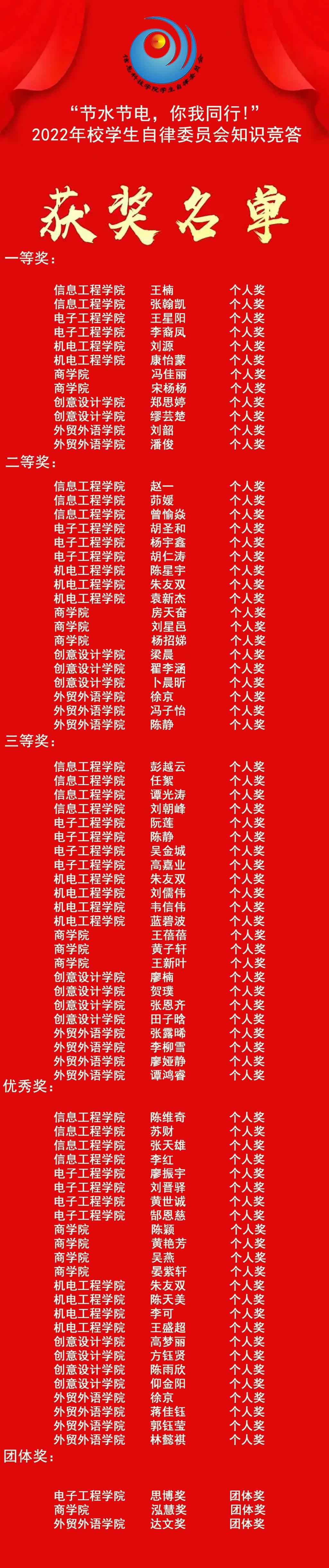 据了解,截止活动结束,本次网络答题参与总人次947次,阅读点击1800次。经各学院学生会代表评审,最终评出一等奖12名,二等奖18名、三等奖及优秀奖各24名,团体奖由电子工程学院、商学院、外贸与外语学院获得。