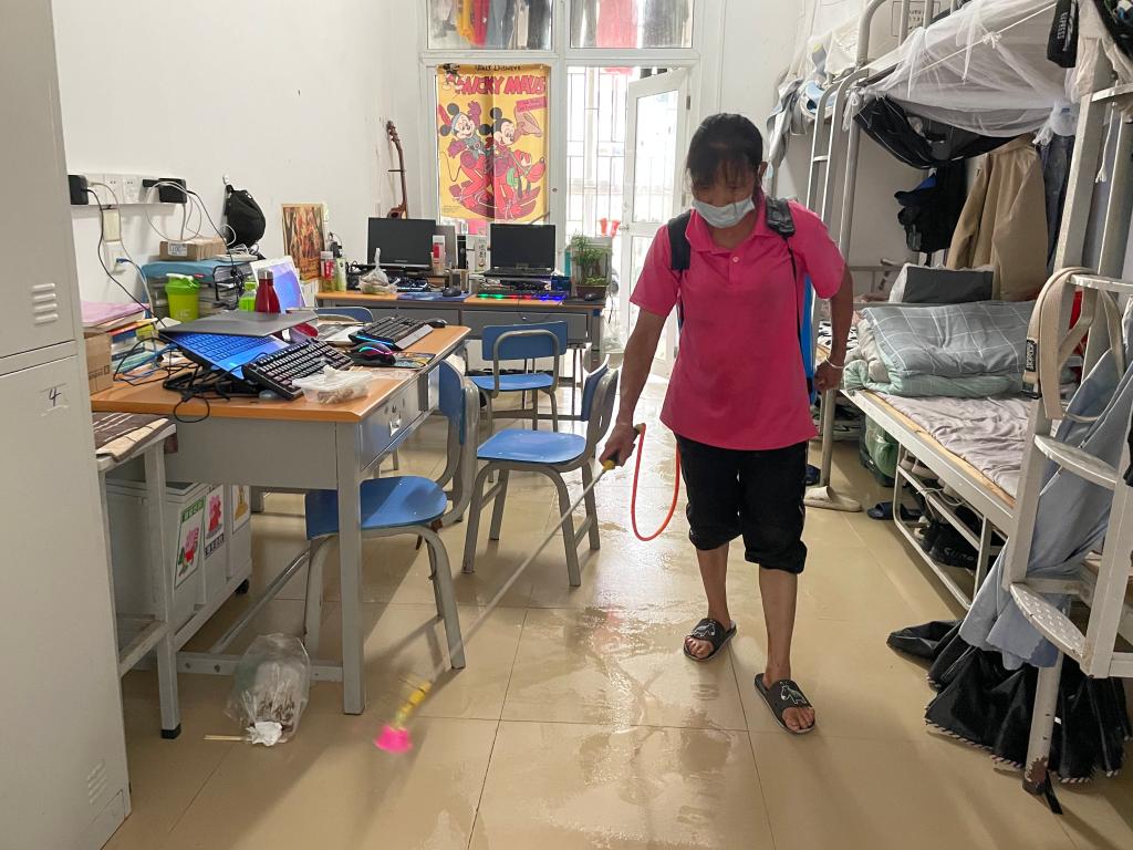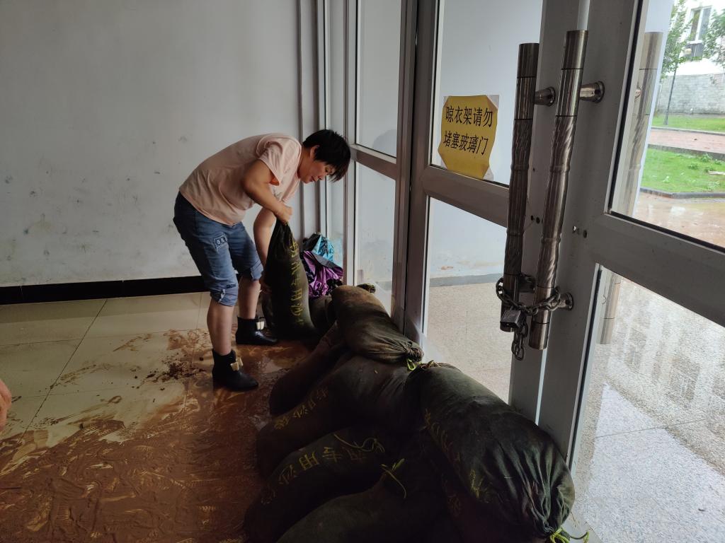 为了切实做好今年的防汛工作,公寓服务中心提前加强对各楼栋楼顶排水管道情况进行排查。5日凌晨2:00,六号公寓因地势低洼发生雨水倒灌,短时间倒灌进学生宿舍,公寓当值员工发现后,第一时间紧急断电,上报部门负责人。根据指示,组织学生堆好沙袋搭建防汛壁垒,处置宿舍进水、一楼大厅电器等,并联系各楼栋值班员对所属楼栋进行查看。上午9:00,公寓全体管理人员到达现场,前往六公寓进行支援,分批对大厅、楼道、楼梯以及35间受灾宿舍进行清理并消杀,经过通力合作,六号公寓内外积水得到有效处理,极大地减少公寓损失,保障了学生寝室财物安全。