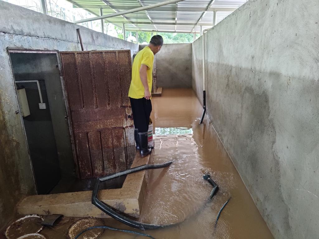 6月5日凌晨2:00,维修中心接到学校内涝紧急通知,当即联系维修师傅入校抗洪,但因周边道路被水淹没导致无法通行,为尽快到校,最后维修师傅选择徒步趟水入校。到校后第一时间切断进水区域电源,并联合保安打开各处井盖加快洪水排泄;待全体维修师傅顺利到校后,巡检并清理配电房、大型设备、路灯线路、人工湖及排水口杂物清除等,其中六号公寓热水机组和2期污水被淹受损,为保障六号公寓学生能够正常使用热水,及时对六号公寓供水泵进行绝缘检查与抢修,在供水泵安全使用的前提下顺利供热。