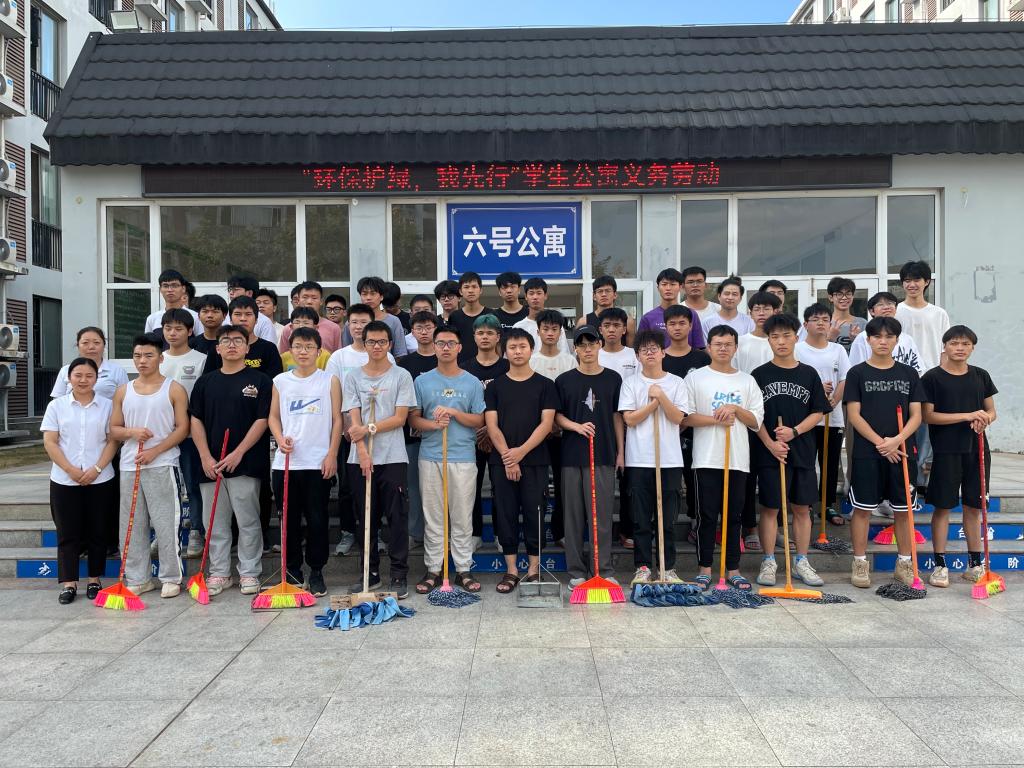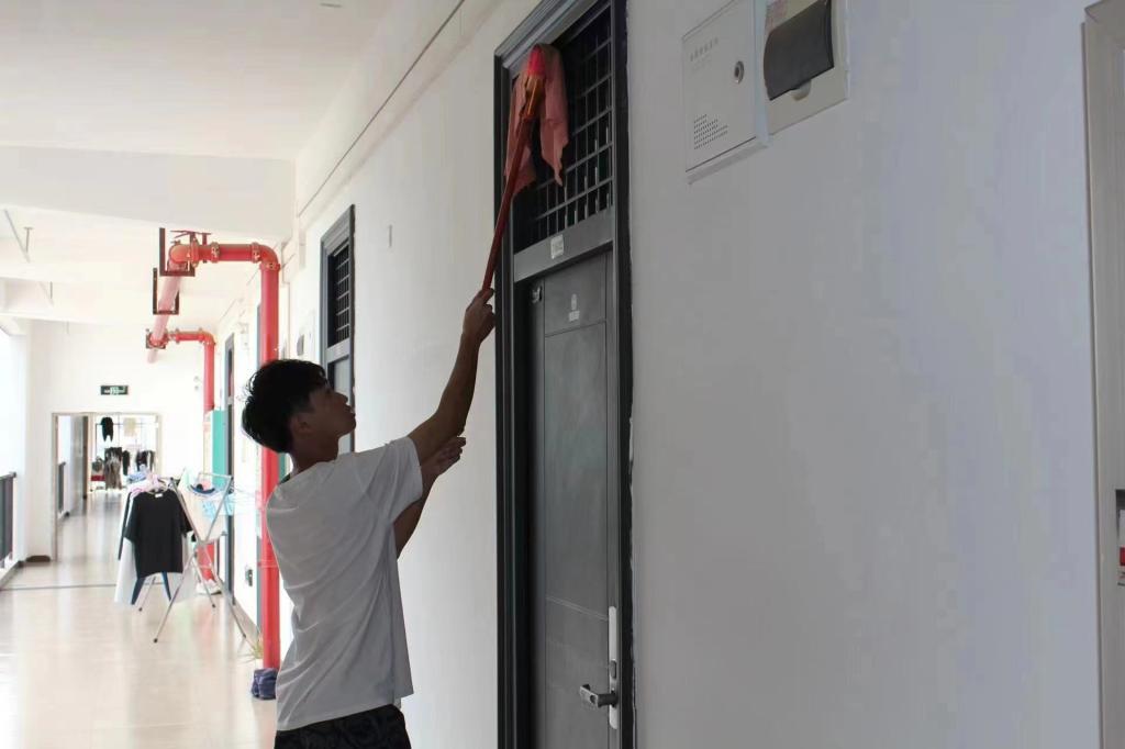 在生活指导老师的带领下,同学们手持工具分工合作默契配合,充分发扬不怕脏、不怕累的服务奉献精神,清扫垃圾、蜘蛛网、擦拭楼梯扶手、宣传栏、捡拾落叶等,在忙碌中深刻体验保洁阿姨们工作的辛劳。在大家的共同努力下,学生公寓内外环境焕然一新。