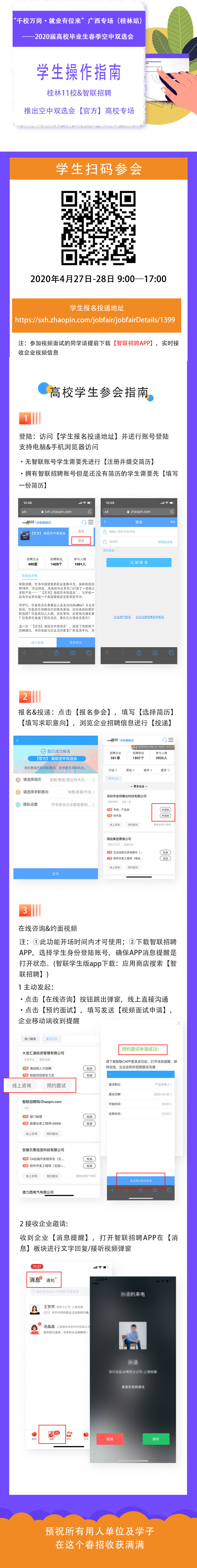 为更好地做好疫情防控期间校园招聘活动,继续为广大毕业生和用人单位提供便捷服务,共青团中央青年发展部、共青团广西区委、广西学联、智联招聘携手桂林11所高校联合开展“千校万岗·就业有位来”广西专场(桂林站)——2020届高校毕业生春季空中双选会。有关报名须知如下:
