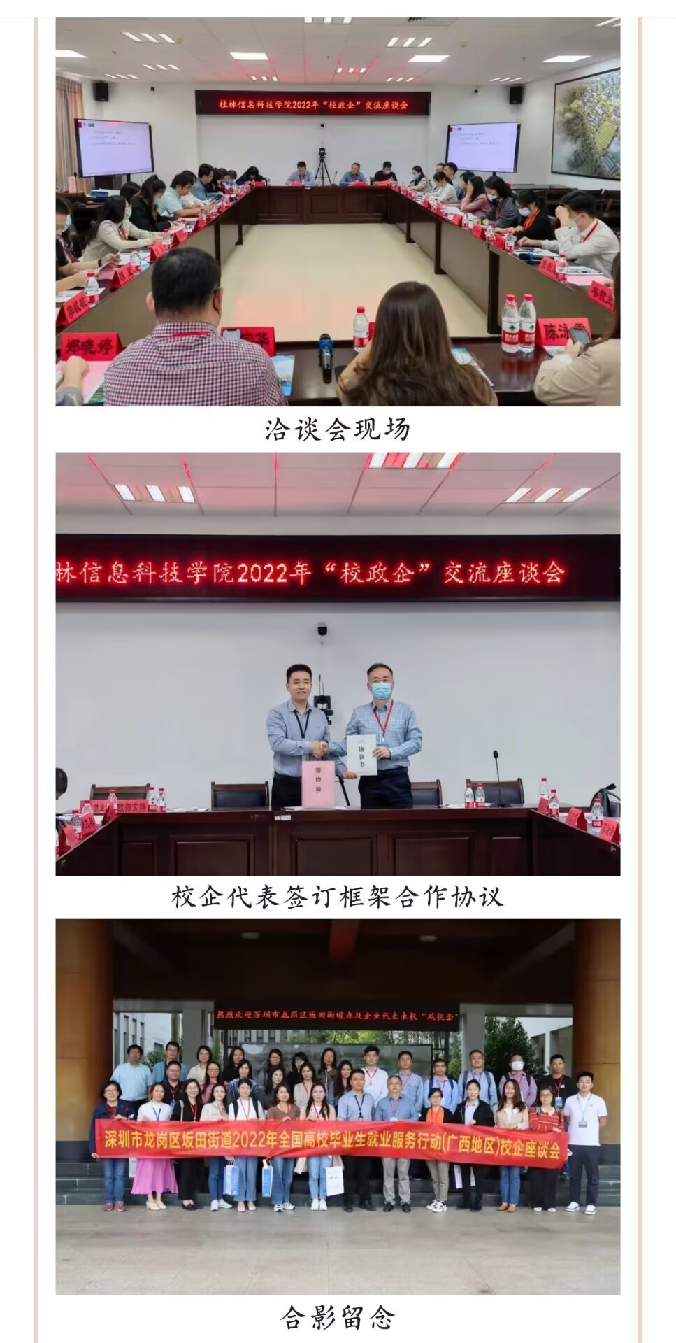 座谈会上,李晓健首先代表学校对廖主任等政企领导代表一行26人的到来表示热烈欢迎。他简单介绍了学校概况和发展历程,以及beat365官网2023届毕业生的基本情况、专业分布以及就业需求等相关情况。他希望各企业代表与二级学院能进一步加强校企合作,深入交流,围绕学生就业、校企联合培养方面拓宽合作领域,实现校企、校政互利共赢,激发就业活力,共建人才培养与供给长效机制。随后,廖建波主任详细介绍了深圳市坂田街道情况、就业环境、就业创业政策与服务,他对信科人才质量的给予高度肯定,欢迎更多优秀的信科学子进入深圳坂田街道实习、就业,期待与学校建立长久的友好合作关系,加快人才互通、资源互通。期间,信息工程学院黄建灯院长详细介绍本院校企联合培养合作模式。其他与会人员围绕人才需求、校企合作等作了交流发言。会后学校各二级学院及招生就业处分别与深圳市唯真电机发展有限公司等6家企业签订框架合作协议并合影留念。