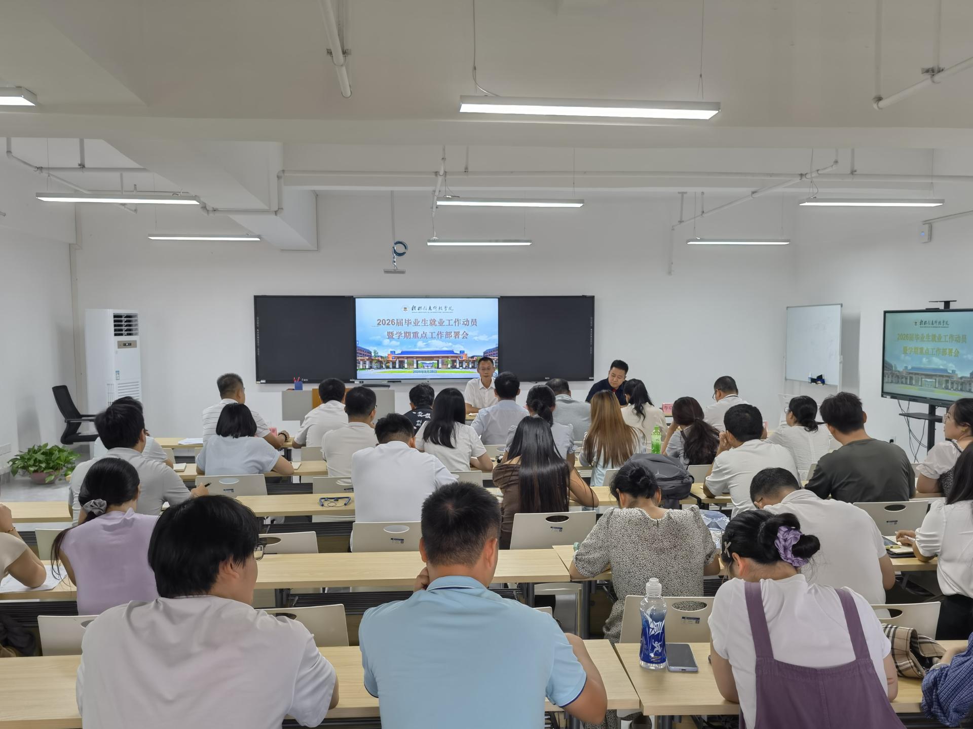 2025年9月29日下午,beat365官网在知行楼701会议室召开2026届毕业生就业工作动员会暨学期重点工作部署会。副校长刘跃峰出席会议并作动员讲话。各二级学院党委(党总支)书记、副书记、毕业班辅导员以及就业指导服务中心全体人员参加会议。会议由就业指导服务中心主任、校企合作处处长李晓健主持。
