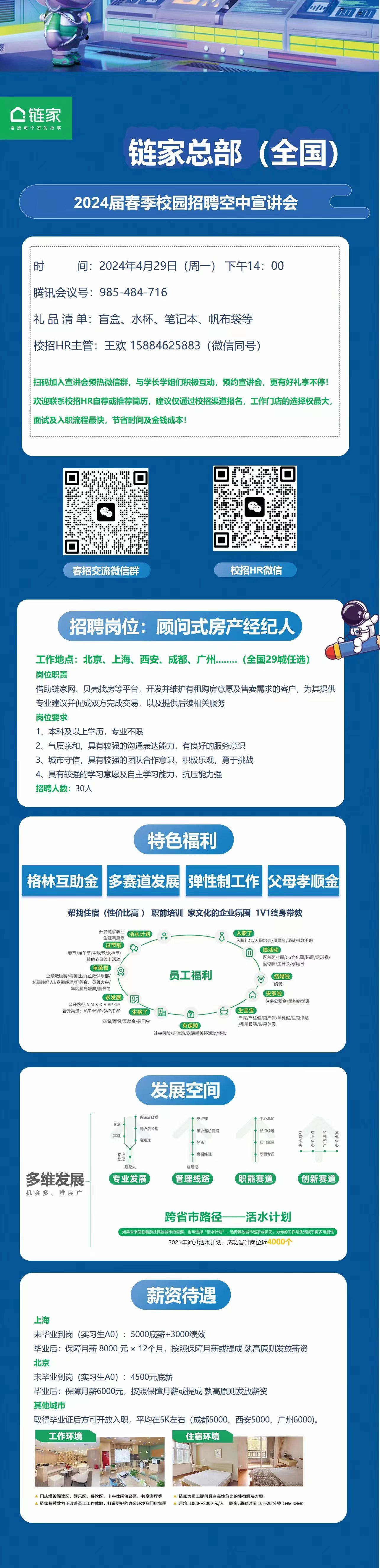 【链家总部(全国)2024届春季校园招聘-空中宣讲会】时间:4月29日(周一) 14:00-15:00腾讯会议室:985-484-716招聘岗位:顾问式房产经纪人(服务 销售类)工作地点:全国29城均可选择(上海8K 北京6K 成都5K 西安5K 广州6K)