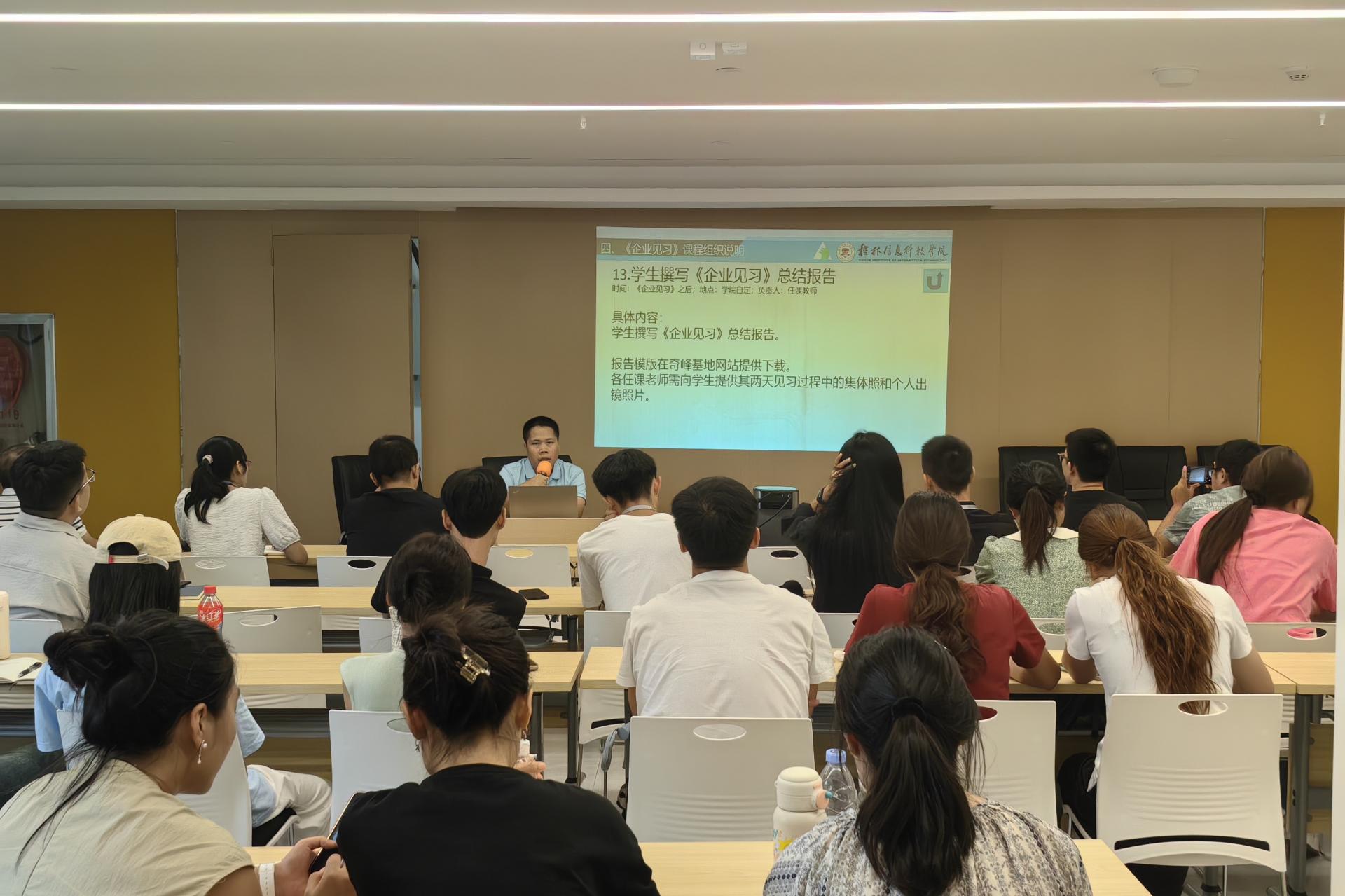为进一步认知企业,提升学生的实践能力,培养符合社会需求的创新性应用型高质量人才,9 月 5 日,学校校企合作处组织开展2024级学生《企业见习》课程组织与实施说明会,旨在确保该课程顺利开展。奇峰产教融合基地职业素养负责人王峰主持说明会,基地唐夏翔老师详细讲解;此次见习教育活动专业教师与2024级全体辅导员参与此次会议。