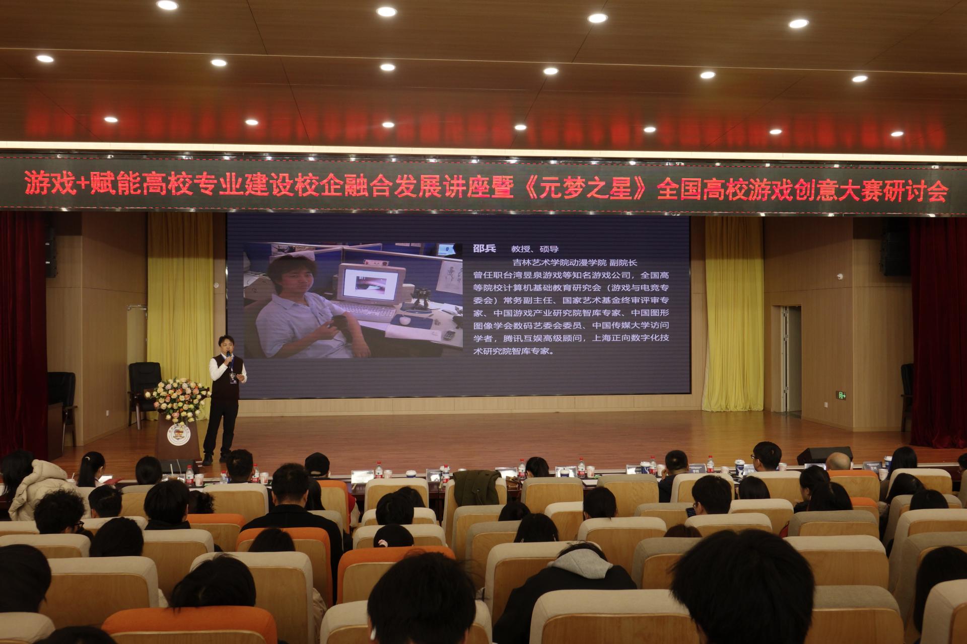 为进一步推动高校专业建设的创新发展,为游戏行业输送更多具备创新思维和实践能力的高素质人才。创意设计学院于12月14日在F107报告厅开展了主题为“游戏+赋能高校专业建设校企融合发展”讲座暨《元梦之星》全国高校游戏创意大赛研讨会。本次讲座共同探讨了高校专业建设与数字游戏产业变革之间的关系,探索智能科技赋能下的数字创意产业新技术、 新产品与新业态, 研究培养新一代数字创意与数字游戏设计人才的新模式,以实现产、学、研、创的紧密融合,并在人才培养目标、毕业要求、实习实训、职业规划上进行共同探讨。本次研讨会邀请到吉林艺术学院动漫学院副院长邵兵、长春建筑学院文化创意产业学院院长张鹏翔、腾讯集团商务经理樊杰、上海正向数位化技术研究院执行秘书长肖甘苏莉作为讲座嘉宾。副校长陈玲萍、创意设计学院院长黄晓瑜及创意设计学院全体教师和大一同学共同参与会议。