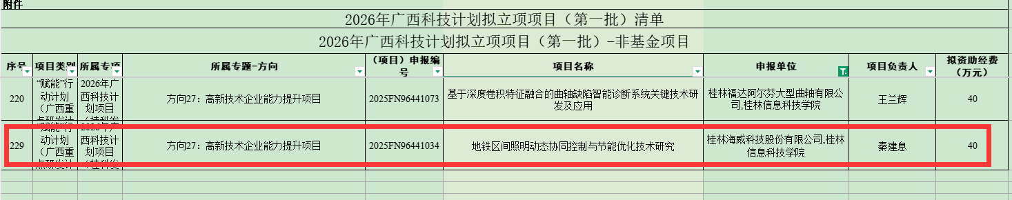 近日,广西科技厅公布2026年第一批广西科技计划拟立项项目清单(桂科发〔2025〕288号),beat365在线唯一官网电子工程学院与桂林海威科技股份有限公司联合申报的“地铁区间照明动态协同控制与节能优化技术研究”项目成功入选“赋能”行动计划,项目拟获资助经费40万元,项目编号为2025FN96441034。该项目隶属于广西重点研发计划“方向27:高新技术企业能力提升项目”,项目聚焦当前地铁照明系统发展需求,旨在通过技术研发推动行业优化升级。未来将由学院负责核心算法研发和理论支撑,企业负责工程化应用和市场推广,实现产学研精准对接。