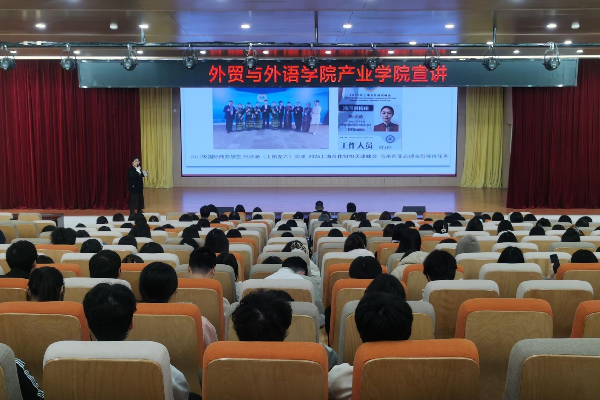 为深化产教融合、推动校企协同育人,帮助学生提前规划职业发展方向,2025年12月17日至18日,外贸与外语学院面向2023级全体学生,连续举办“跨境数字贸易产业学院”与“国际酒店产业学院”两场项目宣讲会。宣讲活动由学院副院长赖安主持,各教研室主任、副主任及相关专业教师共同参与。