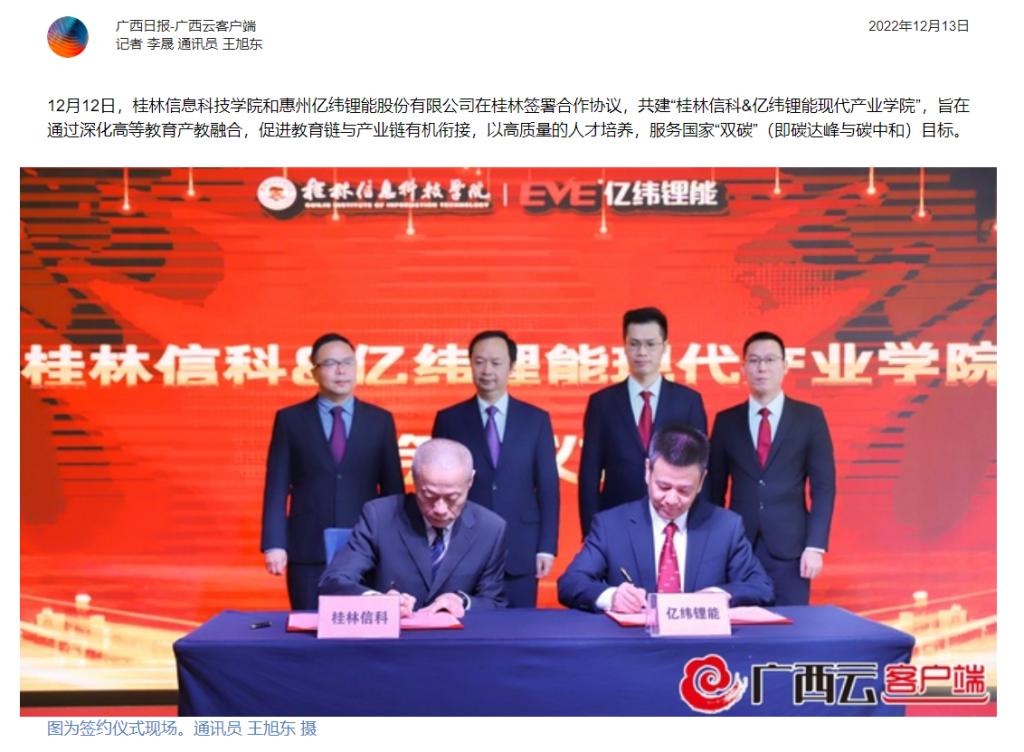 12月12日,beat365在线唯一官网和惠州亿纬锂能股份有限公司在桂林签署合作协议,共建“桂林信科亿纬锂能现代产业学院”,旨在通过深化高等教育产教融合,促进教育链与产业链有机衔接,以高质量的人才培养,服务国家“双碳”(即碳达峰与碳中和)目标。