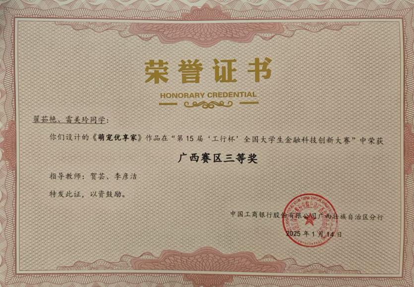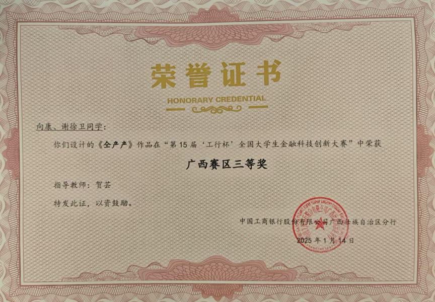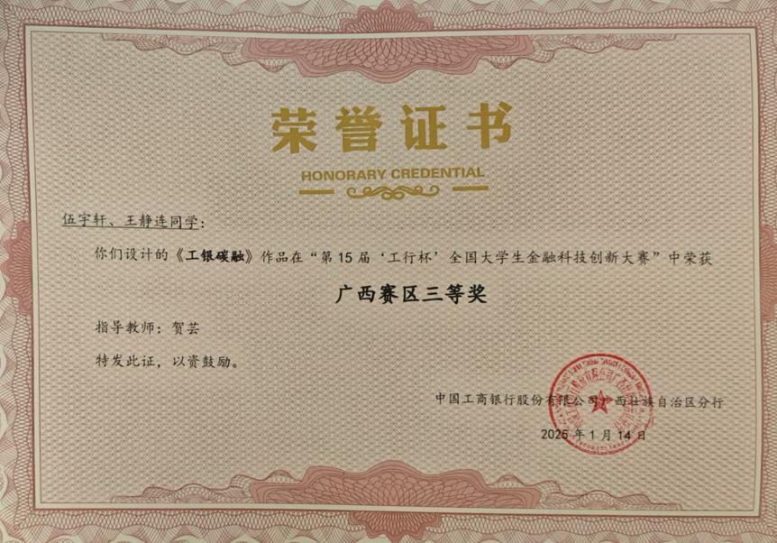 据悉,本次大赛共吸引来自广西区内21所高等院校的1407名同学报名参赛,商学院师生共组建56支队伍100余人次参加本次大赛。学院高度重视此项赛事,紧扣当前金融热点,响应国家政策导向,审慎确定参赛作品选题。师生齐心协力,反复打磨,力求以最优质的方案参赛。最终,陈思蓉、何华美同学的作品《风力发电绿色债券》、翟艳茹、雷美玲同学的作品《萌宠优享家》、伍宇轩、王静连同学的作品《工银碳融》及向康、谢徐卫同学的农产品综合平台《仝铲铲》凭借其优异表现,最终获得广西赛区三等奖的成绩。