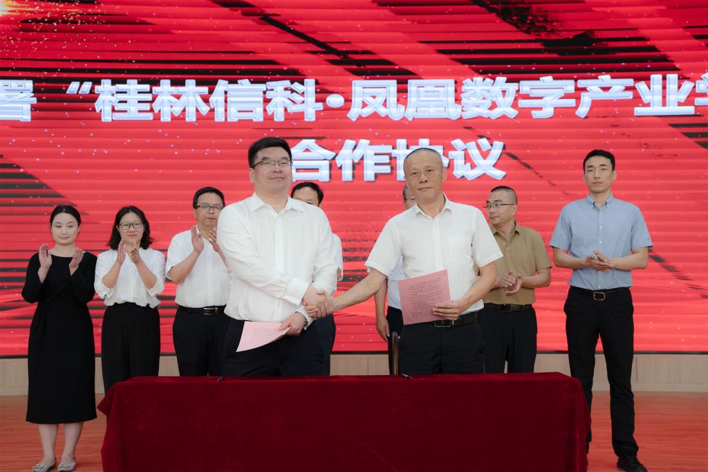 校长梁丁丁代表学校与凤凰卫视威凤国际教育科技(北京)有限公司总经理郭功涛签订桂林信科凤凰数字产业学院合作协议