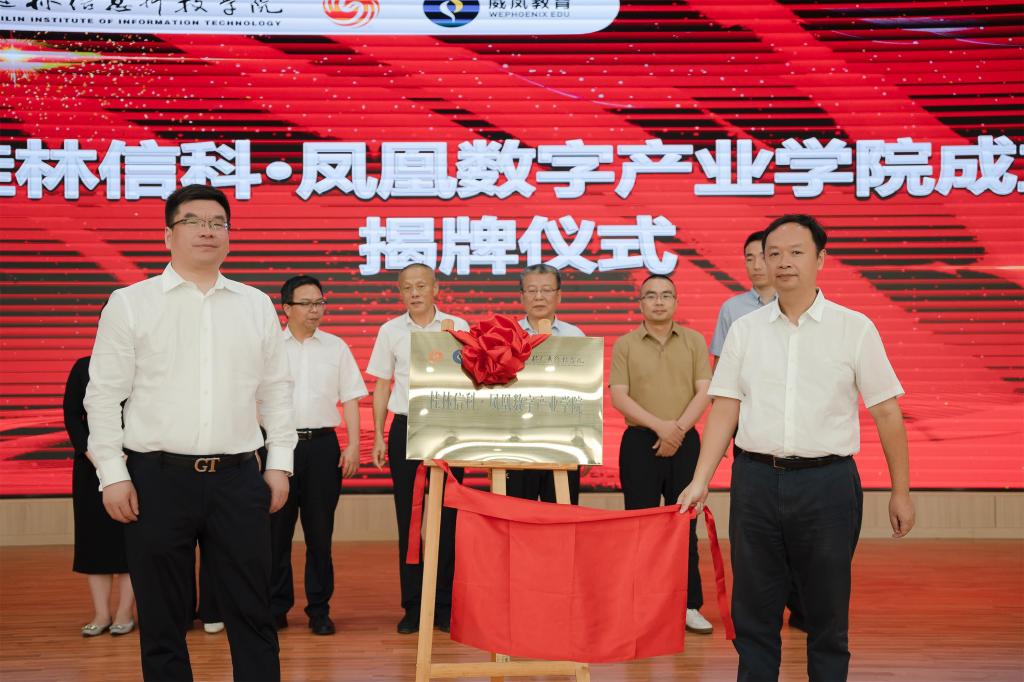 随后,凤凰卫视威凤国际教育科技(北京)有限公司总经理郭功涛向校长梁丁丁颁发捐赠牌,董事长罗欣向中国教育发展基金会秘书长王建光颁发感谢牌,并向凤凰卫视威凤国际教育科技有限公司总经理郭功涛颁发捐赠证书及感谢牌。校长梁丁丁代表学校与凤凰卫视威凤国际教育科技(北京)有限公司总经理郭功涛签订桂林信科凤凰数字产业学院合作协议。在三方领导、嘉宾和师生代表的共同见证下,罗欣董事长和郭功涛总经理共同启动数字产业学院,共同为数字产业学院揭牌。