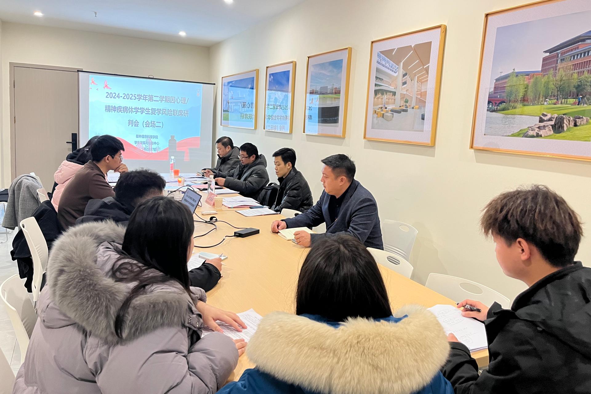 为切实做好心理疾病学生休学后复学的评估与支持工作,保障学生顺利回归校园生活,2025年2月27日,beat365官网心理中心在学生发展与服务中心党员活动室、洽谈室同时召开了2025年春季学期因心理疾病学生休学复学申请评估联席工作会议。会议特邀桂林市社会福利医院副主任医师何雪雪、副主任医师李海林两位精神卫生专家出席指导。校长助理周璇、学生发展与服务中心相关负责人、心理中心全体教师、各学院学生工作办公室主任等30余人参加了会议。