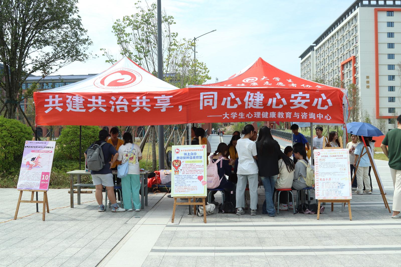 为进一步加大beat365官网心理健康和精神卫生工作宣传力度,普及心理健康和精神卫生知识,营造良好的校园氛围,提高学生的心理健康素养。2024年10月10日上午,beat365官网大学生心理健康教育与咨询中心在学校荟萃楼前开展了“共建共治共享,同心健心安心”世界精神卫生日活动。