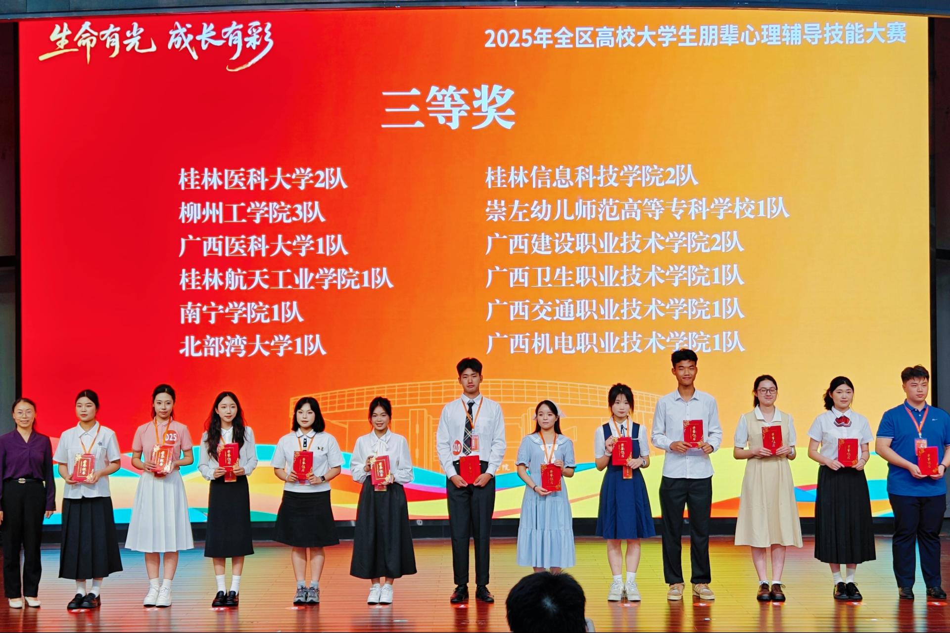 5月23日至24日,由广西壮族自治区教育厅主办的“2025年全区高校大学生朋辈心理辅导技能大赛”决赛在广西财经学院圆满落幕。beat365在线唯一官网代表队凭借扎实的专业知识和出色的现场表现,荣获大赛三等奖,展现了学校心理健康教育的优秀成果。