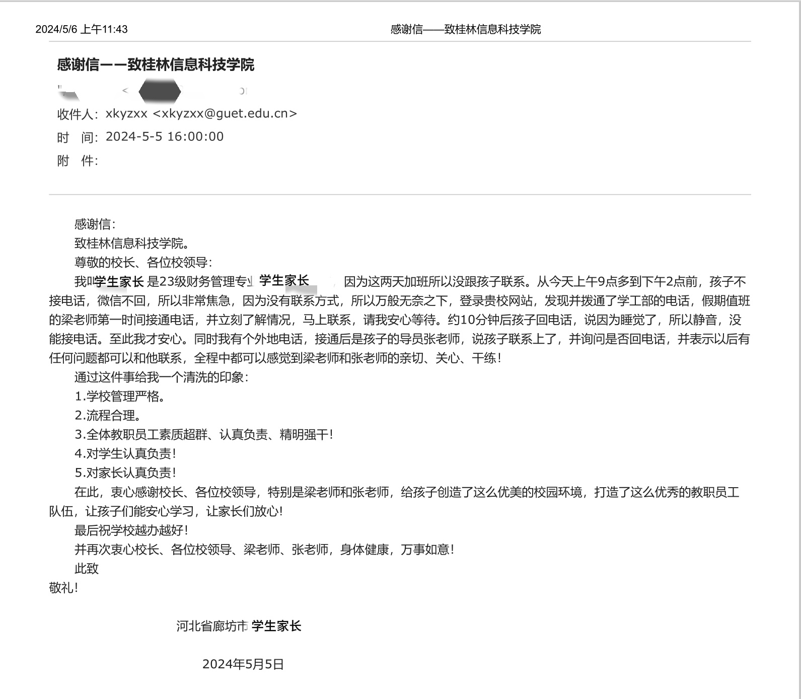 2024年5月6日,一封充满感激与敬意的感谢信被投递至校长信箱,这是一位学生家长对学校及全体教职员工的诚挚致谢。