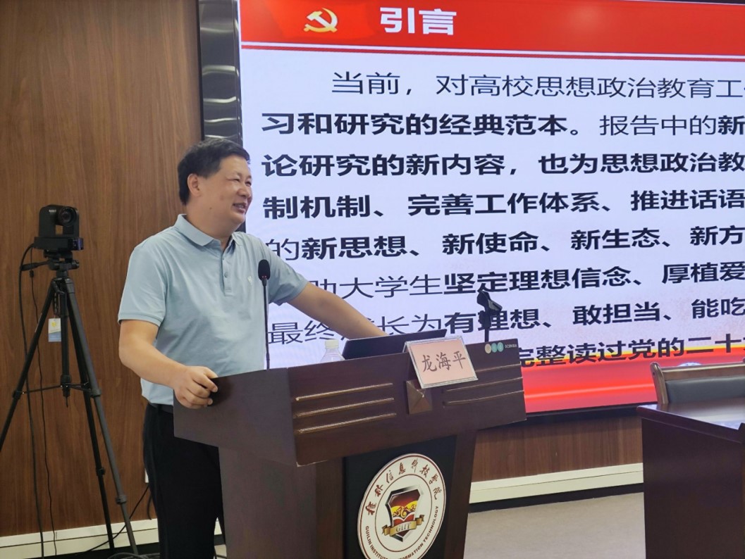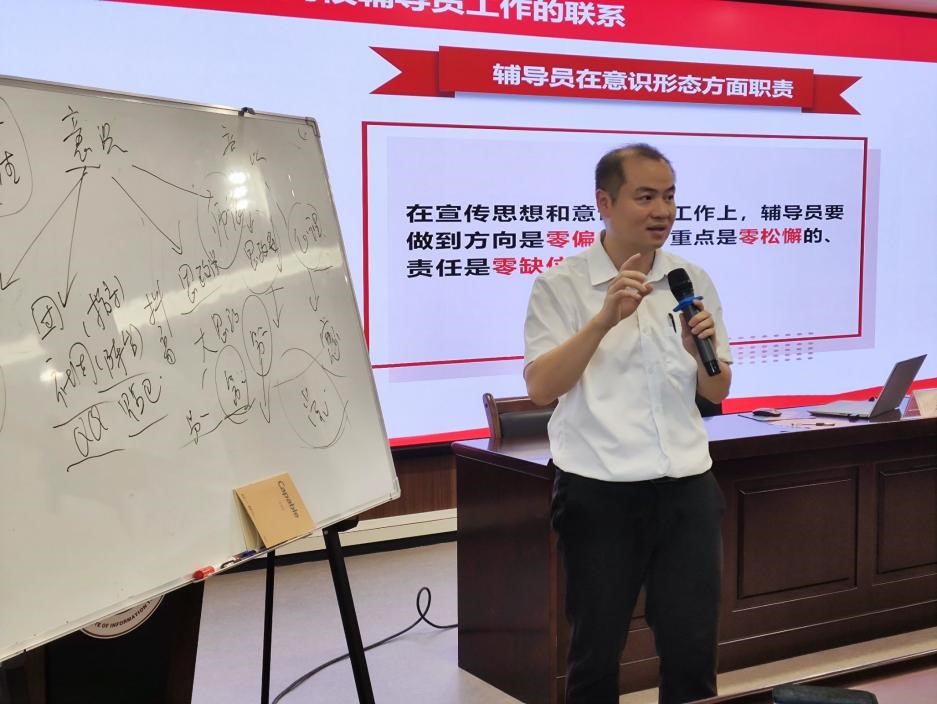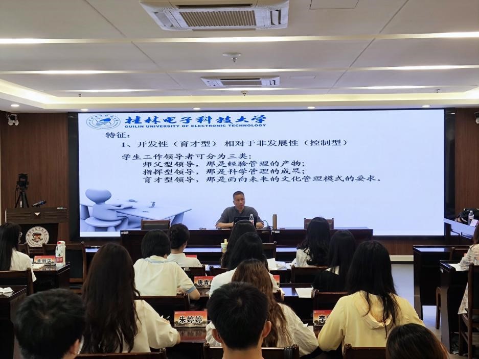 桂林电子科技大学计算机与信息安全学院、密码学院、软件学院党委书记文辉、郭庆教授、学校党委宣传部部长、融媒体中心主任张文源、桂林理工大学党委武装部部长、党委保卫工作部部长、保卫处处长张瑞、学校党委委员、党群事务部部长王南萍、桂林电子科技大学马克思主义学院系主任龙海平、桂林电子科技大学学生工作处副处长张华东分别就《安全稳定与辅导员工作》《砺学风、筑师魂——信科合格评估的主力军》《意识形态与辅导员工作》《辅导员工作成果化及科研能力提升》《党建与思想教育》《高校思想政治教育的新形势新使命新任务》《辅导员心理健康教育实务》进行了剖析;桂林理工大学艺术学院团委副书记梁璇以一线辅导员身份就《新形式下辅导员如何做好班级建设与管理》进行了交流。