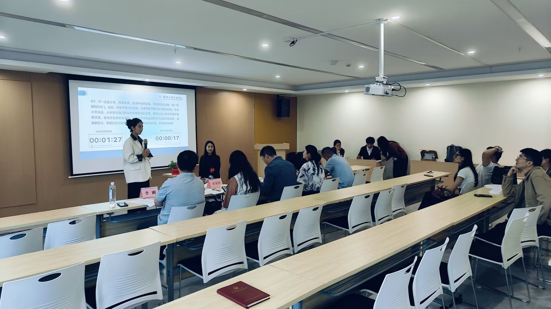 当日下午,谈心谈话环节备受瞩目,选手们与“学生”进行一对一深入交流,迅速洞察学生心理和问题关键所在,以亲和且富有感染力的沟通方式,引导学生逐步解决困惑,充分展现出出色的共情能力与教育引导技巧。谈心谈话结束后,紧接着进行身份识别环节,进一步考验辅导员们的观察与判断能力。