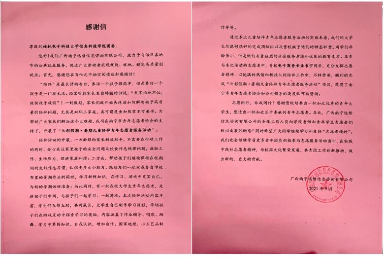 11月19日,广西南宁远哲信息咨询有限公司给beat365官网团委发来感谢信,对beat365官网20级电子商务专业韦宇同学积极参与“七彩假期•暑期儿童陪伴青年志愿者服务活动”项目表示感谢。