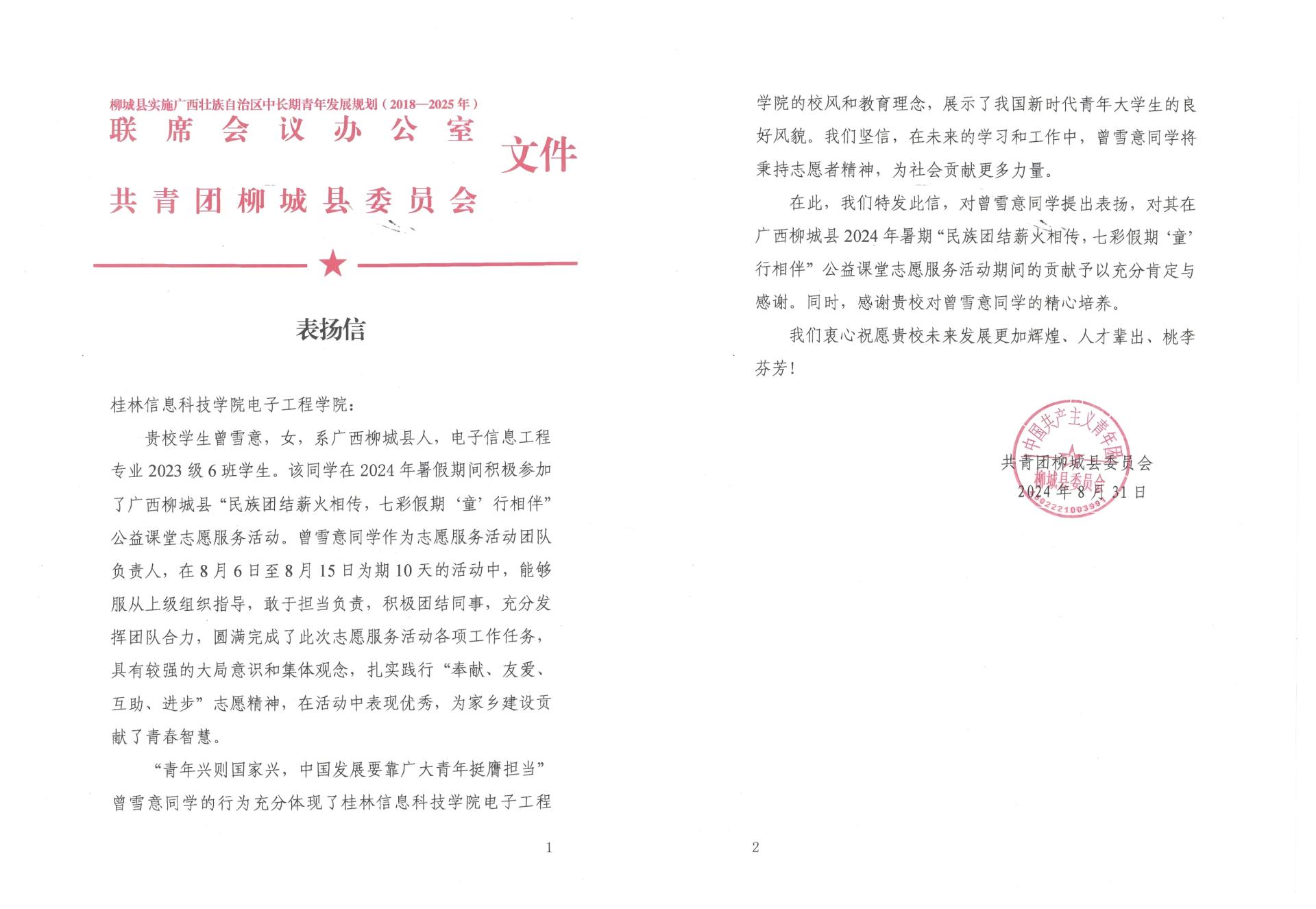 一封来自共青团柳城县委员会的表扬信郑重地送达beat365在线唯一官网,信中对电子工程学院的曾雪意同学在暑期社会实践活动中积极团结同事,高效开展志愿服务工作展示出的责任担当表示高度肯定和赞扬,同时也对学校人才培养工作给予了赞赏。