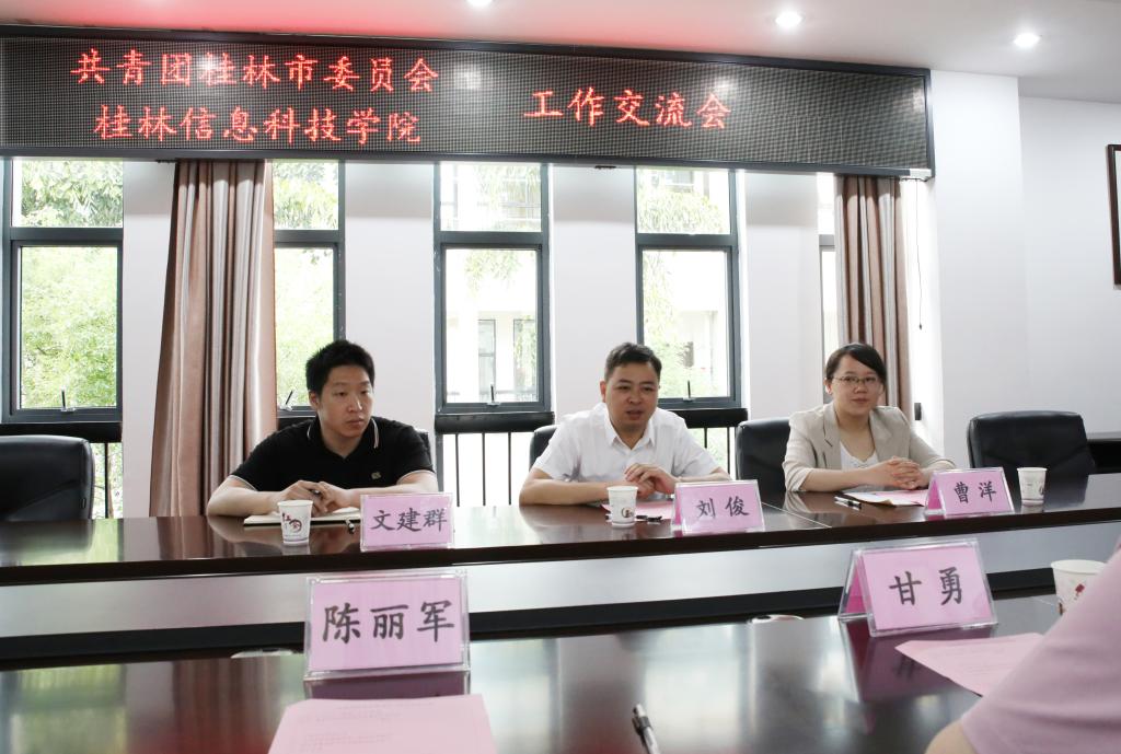 共青团桂林市委来校交流考察共青团工作6月2日上午,共青团桂林市委副书记刘俊、曹洋一行来校交流考察共青团工作,学校党委书记甘勇会见了来宾,党委学生工作部、校团委相关同志参加座谈会。甘勇书记代表学校对团市委领导一行表示热烈欢迎,对共青团桂...