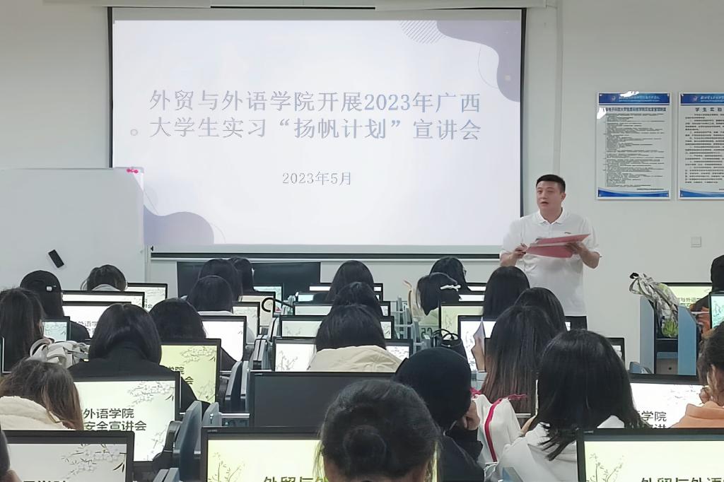 外贸与外语学院开展2023年广西大学生实习“扬帆计划”宣讲会为做好2023年广西大学生实习“扬帆计划”工作,5月10日,外贸与外语学院召开2023年广西大学生实习“扬帆计划”宣讲会,会议由2020级辅导员蒋勇主持,全体2020级学生参加。会上,蒋勇老师首先介绍了“扬帆计划”分...