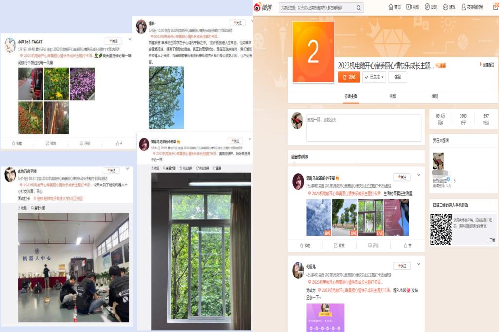 机电工程学院开展2023年“ 敞开心扉,美丽心情,快乐成长”主題14天美丽...为了教育引导大学生树立团结友爱、互帮互助、携手共进的意识,培育大学生自尊自信、理性平和、积极向上的健康心态,5月1日-5月15日,机电工程学院在新浪微博超话区开展“ 敞开心扉,美丽心情,快乐成长”主題14天...