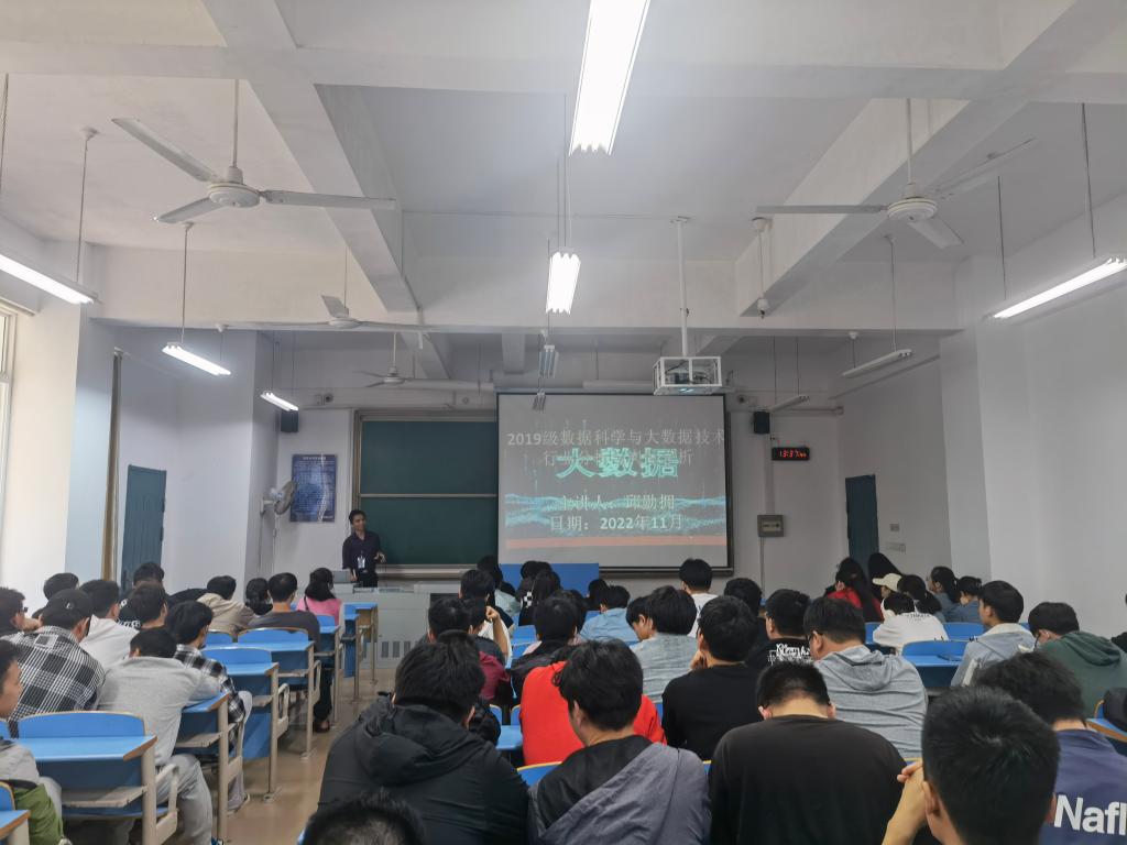 会上邱勋拥老师针对大数据专业的成立背景、专业优势、专业岗位设定等方面进行解读。随后,邱老师针对近几年该行业的就业情况进行详细分析,主要为不同的工作方向、不同区域的就业机会和薪资等。邱老师对同学们毕业后的求职意向进行了问卷调查,并创建了19级数据科学与大数据技术专业“优就业”群,为今后了解毕业生就业动向搭建了桥梁。
