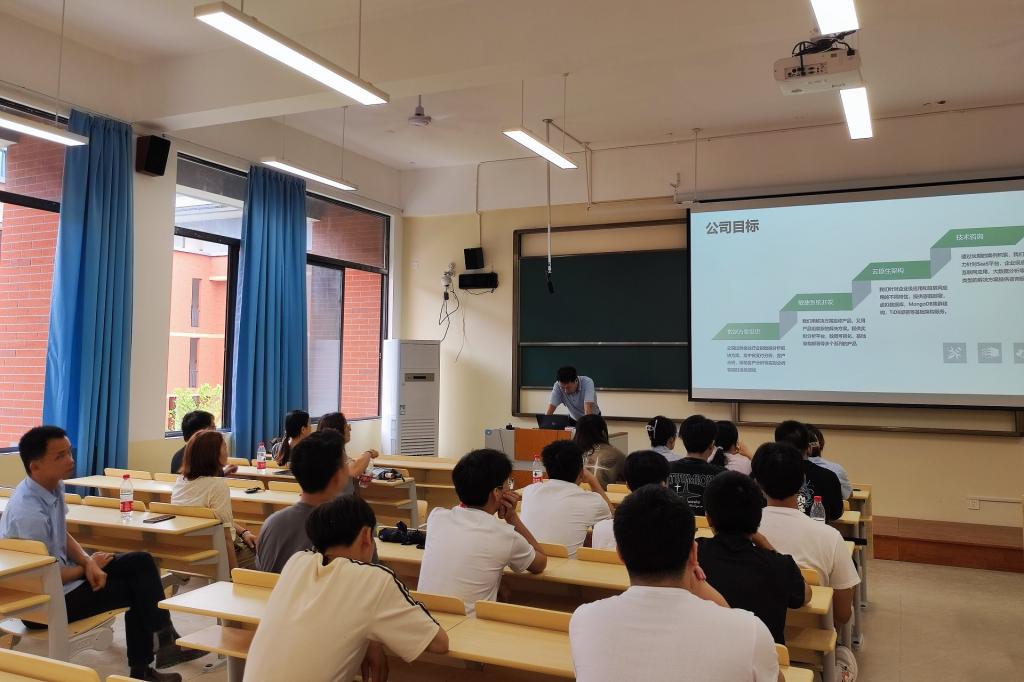 分公司经理袁强远进行宣讲,主要从公司概况、业务情况、技术路线、工作岗位与要求、薪资待遇等方面做了详细介绍。此次企业宣讲,公司提供的岗位涵盖大数据分析、后端开发等。宣讲会上,公司大数据事务部马主管向同学们分享了自己的学习、工作经历,鼓励同学们学会学习、学会规划、与企业需求相结合,努力实现自己的人生目标。此次宣讲会为同学们提供就业岗位的同时,也帮助同学们进一步明确了自己的职业规划和就业方向。
